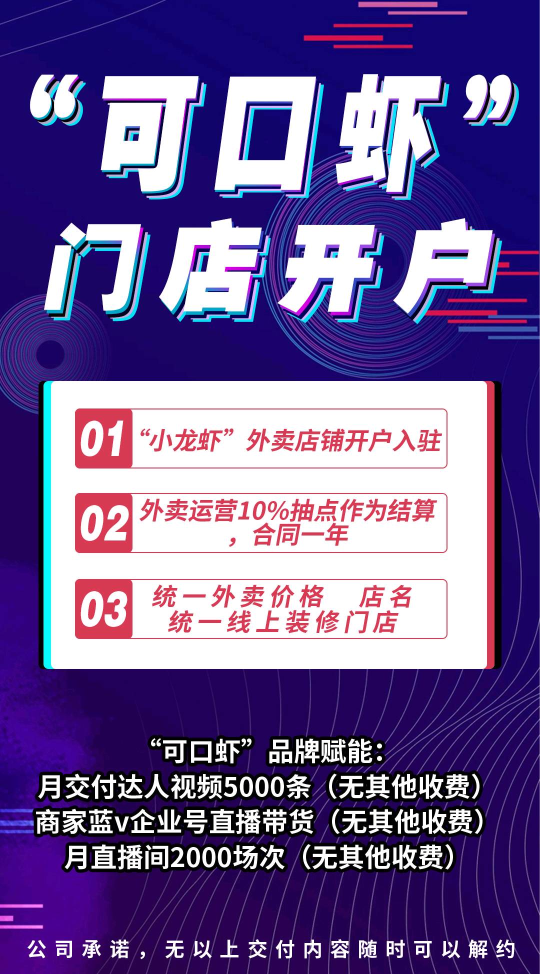 每月对品牌输入5000条视频覆盖,提升品牌及品牌门店热度,每月对品牌输入直播场次2000场,提升品牌及其品牌门店外卖销售量 。