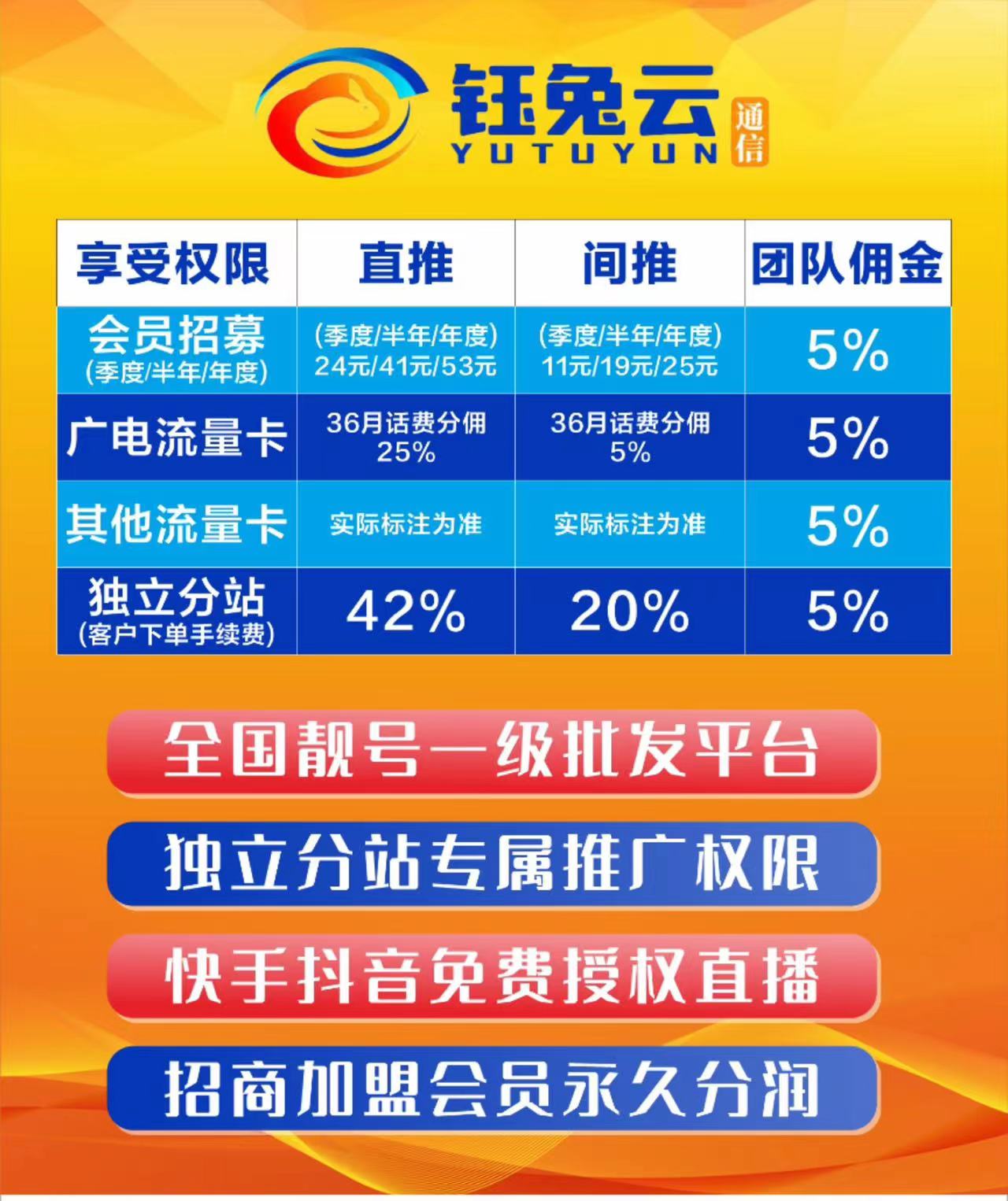 中国第四大运营商中国广电砸钱500亿抢占市场,每月192G 全国通用5G 流量不限速,月租19元,首月免费,通话0.1元一分钟,全国可做,加入平台合伙人 推广一张卡分佣280元,3级分佣,直推提成、间推提成,授权直播售卡。