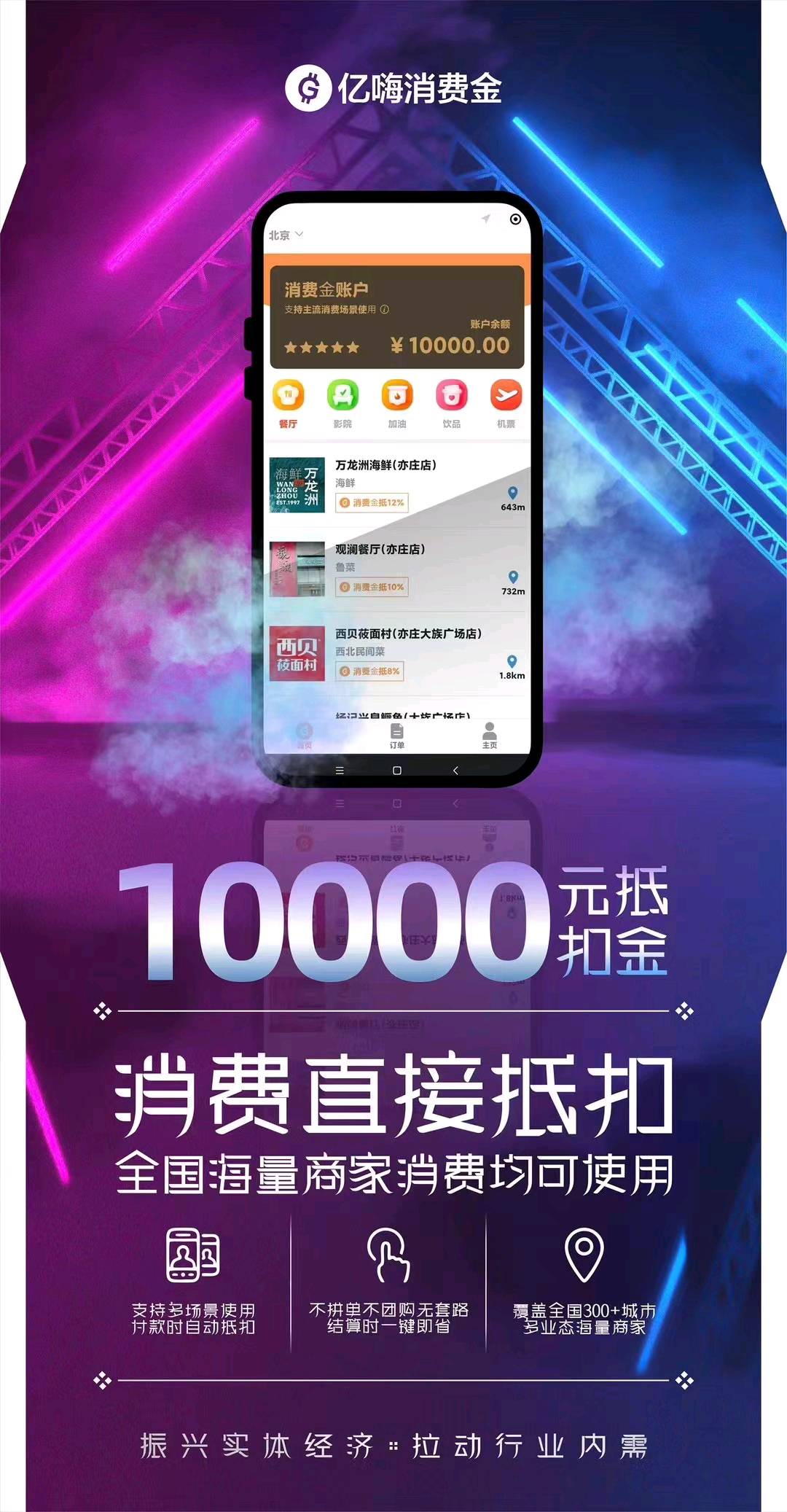 亿嗨消费金到底怎么样,给你1万消费基金,不需要你充值,也不会过期,假期黄金时间也可以使用,没有最低消费,不是消费回扣,不是群体,不限于类别,直接作为现金,也可以叠加使用。支持餐饮连锁、快餐连锁、全国影院、加油站、机票、酒店、旅游、超市等。一个小程序,可以随意享受全国千万家店铺5%-30%的折扣,无限时间和地点!!