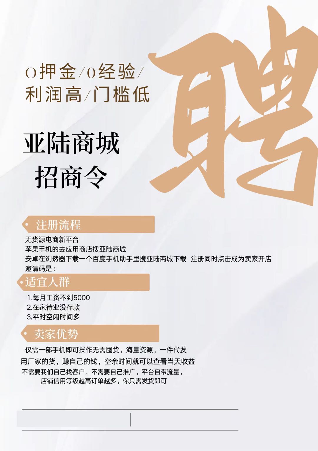 正文 亚陆商城招募合伙人 app拉新推广一手接单平台 V评论者 /2023-05-24 05:03:50/3.27 K阅读/0评论 0524 亚陆商城项目介绍我来解答你所有问题,一个单只需一件成本支持一件代发,平台一对一免费教学不需要任何学费,两天包开单合作要求适合任何群体,可当副业可当主业收益利润收益无上限费用说明不收取任何费用扶持培训免费培训直到开单 资源图片: