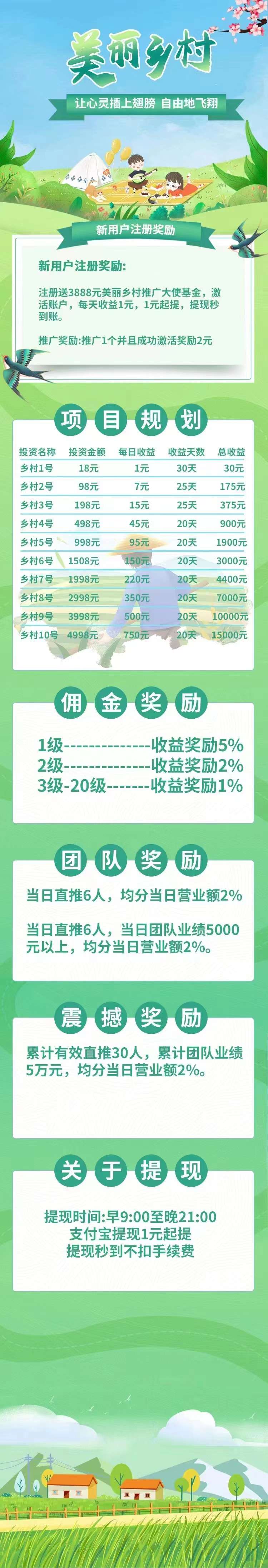 新用户注册送3888元美丽乡村推广大使基金,激活账户,每天收益1元,1元起提,提现秒到账。推广奖励:推广1个并且成功激活奖励2元