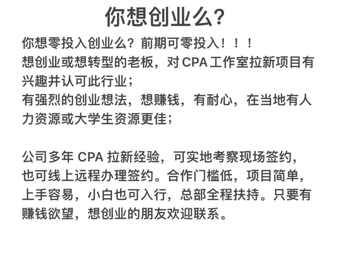 ①、有一定的社会资源,想创业或想转型的老板,热爱认可CPA推广行业。