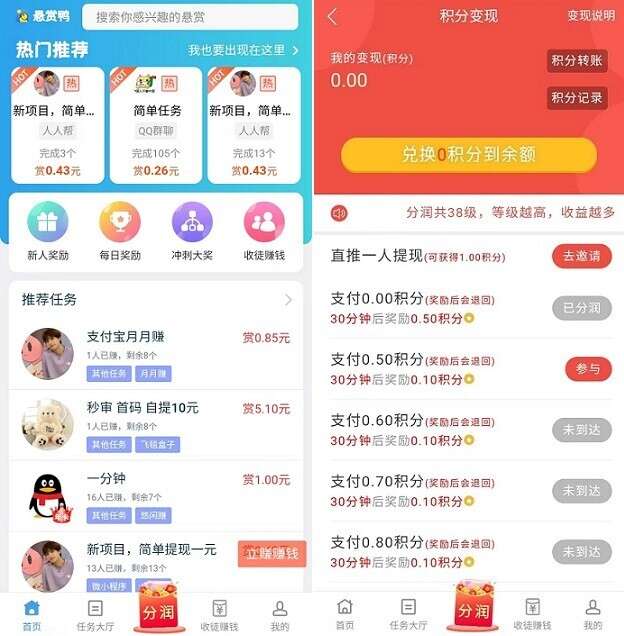 悬赏鸭是一个悬赏任务、积分分润赚钱平台,完成任务得佣金,每天登录领积分,每个等级的积分都会提高,积分分润模式,可直接兑换余额提现,1积分1元,直推首提奖2元,间推首提奖1元,2元起提,任务二级分成。