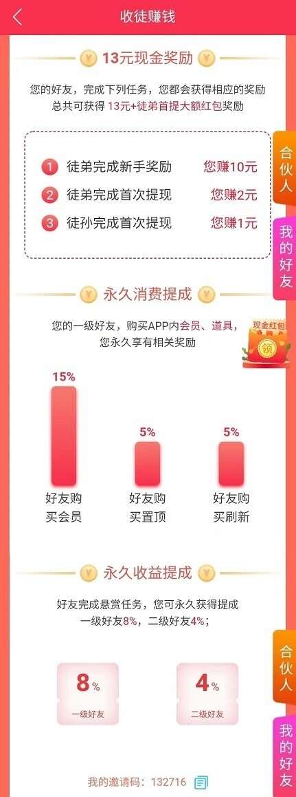 直推提现奖励2元,间推提现奖励1元,任务直推分成8%,间推4%。