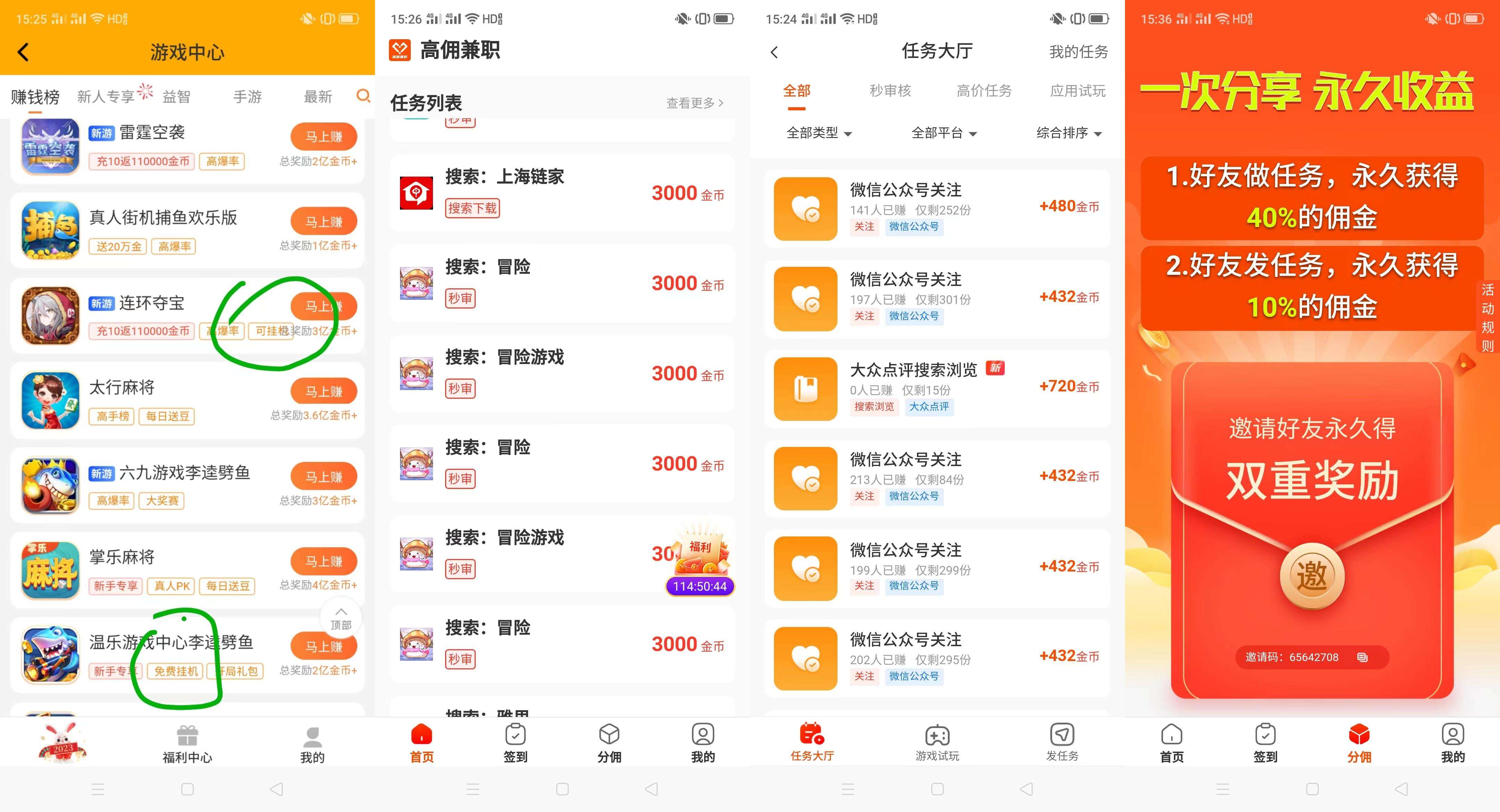 高佣兼职是一款包含海量悬赏任务、秒审任务和游戏试玩任务的赚钱平台,用户闲暇时间在平台完成任务,可以获得高额收益。平台任务多为点赞、关注、浏览、小程序授权游戏试玩游戏挂机等,每天都可以做,任务数量实