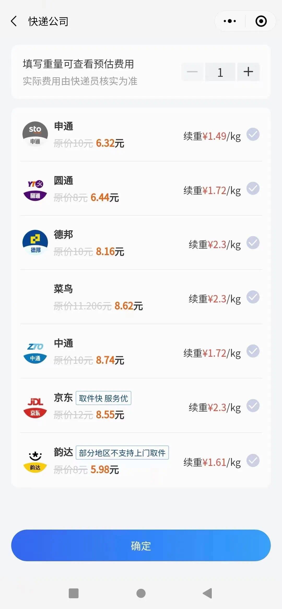 目前平台与全国快递公司达成战略合作对接,接入了圆通、韵达、德邦、中通、京东、顺丰等多家快递企业,实现了一站式服务,信息透明化一键比价服务,免费上门取件服务。