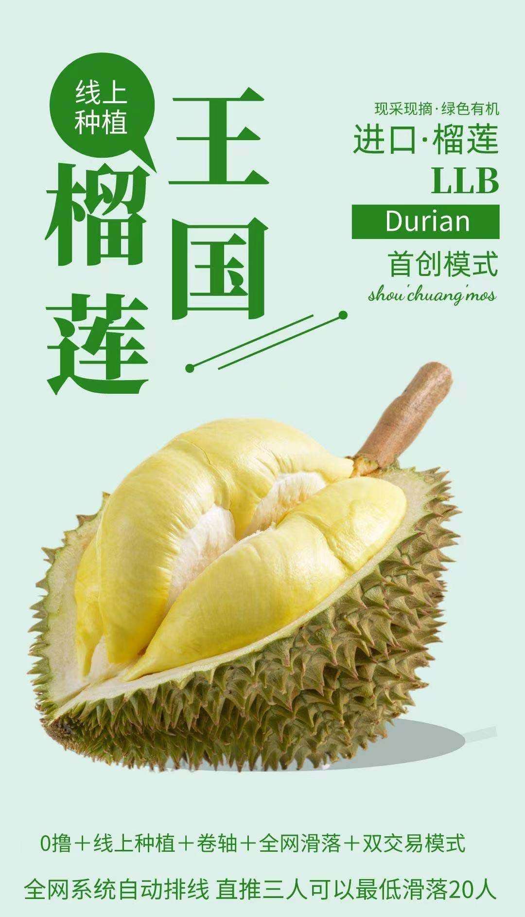 一年一度的全新首码模式来了 线上种植线下门店直接兑换榴莲 0撸会员每月可以撸一个4斤以上榴莲 不想要榴莲直接可以卖掉赚120到130以上 投资玩家月赚百分之五十左右 0泡沫项目