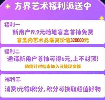 正文 方界艺术:注册免费开盲盒,1键秒卖,推广1人奖励6元 xd3042 V评论者 /2023-06-19 09:30:00 /2001 阅读 0619 方界艺术,新出的数藏平台,登录后免费开一次盲盒,开到东西后去“我的艺术品”页面可直接卖掉,一键秒卖,卖掉的钱可以提现,推1人给首次开盲盒奖励6元,满49元、倒计时5日后可提现。VX扫码注册:登录后可免费开一次盲盒,测试了1个随机盲盒给了30元,开盲盒的时候选择余额支付,首次免费,抽到后可直接卖,也可到“我的艺术品”页面卖掉,一键秒卖。推1人给首次开盲盒奖励6元,上不封顶,满49元可提现,建议0撸。