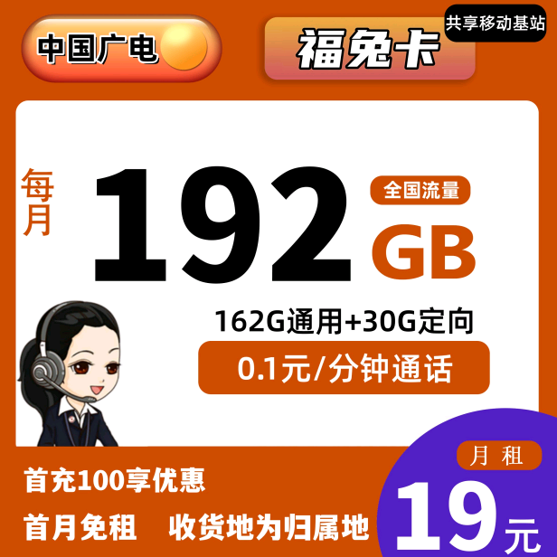 中国广电:福兔卡19元192g(首月免费,第2-6月是19月租,第7个月开始就29月租)