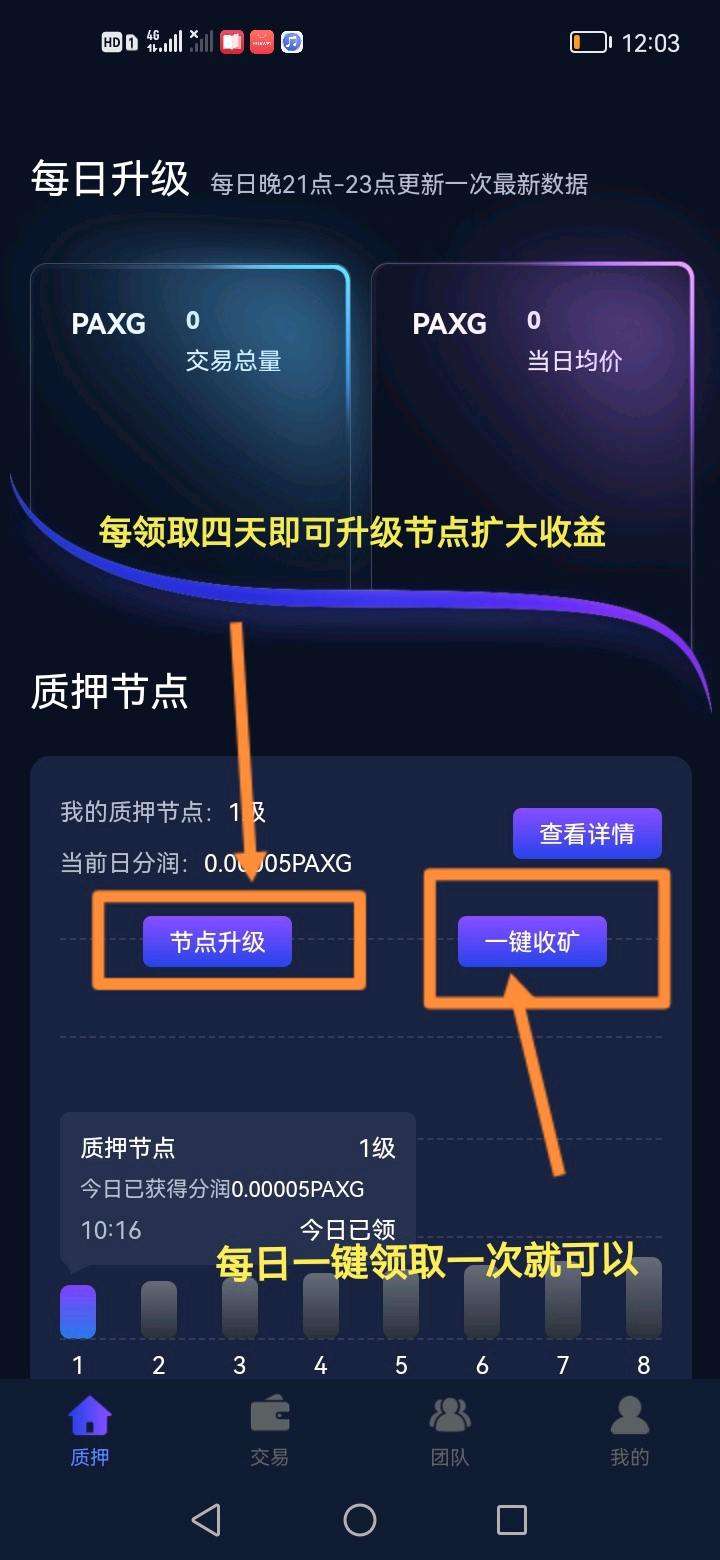 零撸的0.00005个B。4天升节点。最高节点41级每天产0.75个B价值12000