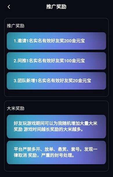 直推奖励200金元宝,间推奖励100金元宝,团队新增1人奖励20金元宝。