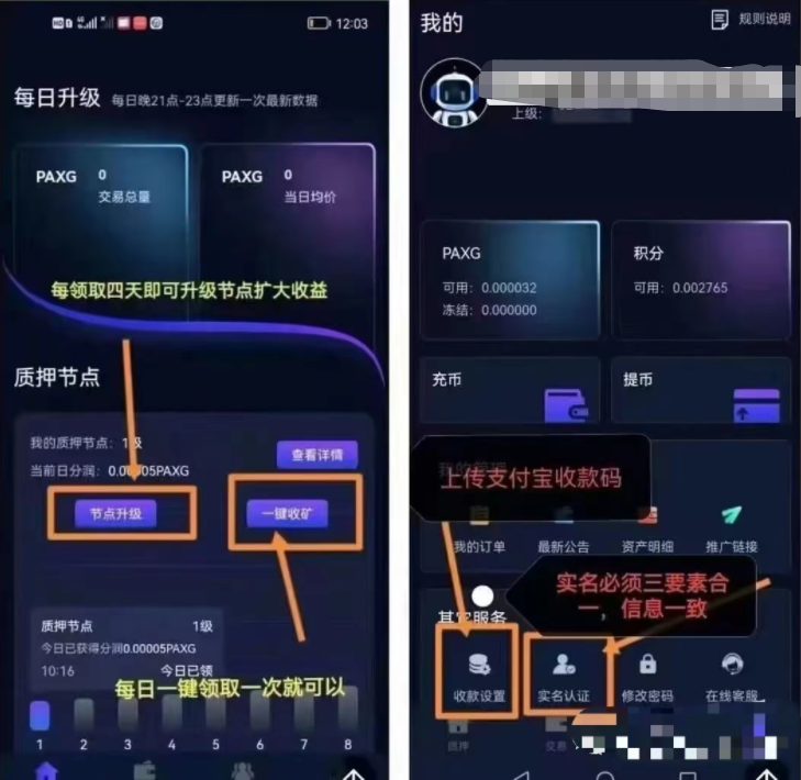 (除了每天挖矿产出也可以存着后面买分红宝,每天都有分红,晚上11点有分红拿,收款设置里面支持支F宝收k码,买家大多数都会要求,因为方便!)