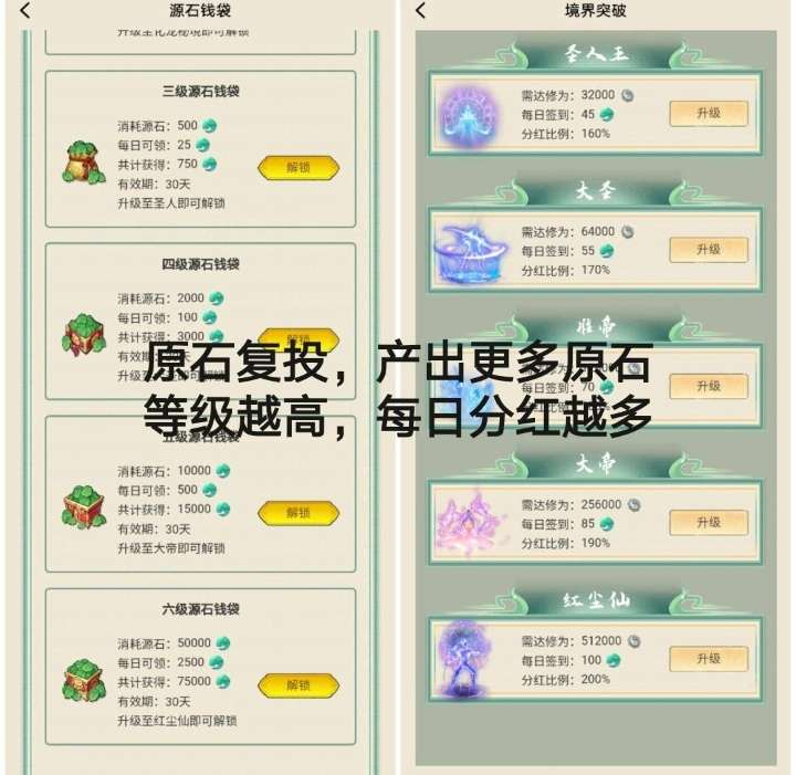 源石刷副本提高修为值-每日领取永久分红-升级境界提高分红比例