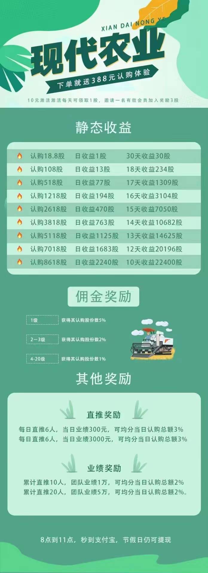 正文 现在农业,注册就送388元,没分红,速度上车! zxc6522320 V评论者 /2023-06-29 15:08:48 /2687 阅读 0629 仅需18.8元就能开始认购摩根基金,注册就送388,体验基金,每日分红股份,市场自由交易分红模式推荐会员认购,只要下级认购均有股份分红,下级会员1-20级以内认购均有5%-1%分红。其他奖励除了下级认购分红以外,平台还设有直推奖励,以及业绩奖励,每天晚上12点达标用户自动分红。交易说明每日股份分红后,可以直接提现,每日提现时间为8:00-2300,提现无手续费秒到支付宝