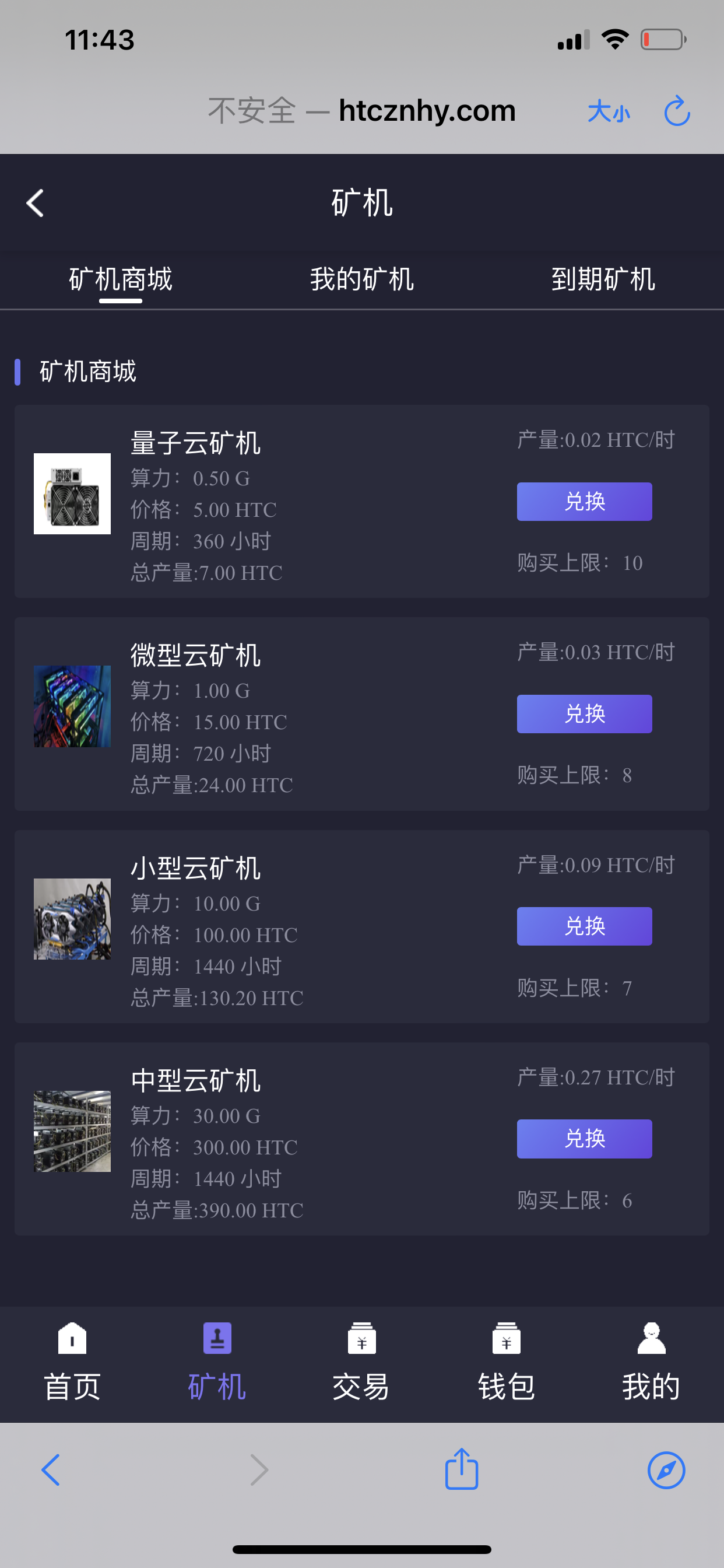 Htc智能挖矿,实名认证送一台矿机30天,一天0.4个币,签到一天0.1个币,第一次收矿是3天后收,一次收3天的矿!以后一天一收!新手10天就可以兑换一个更高级的矿机!内置交易系统,玩家点对点交易!目前1htc=1.553美元!每天都在涨价!