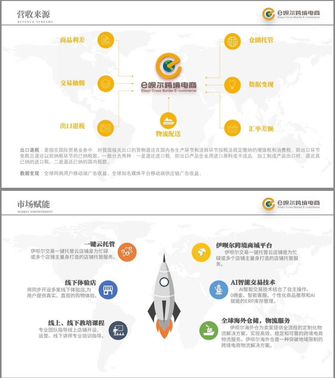 伊呗尔跨境电商平台作为交易的中介,为卖家和买家提供交易撮合、支付和客户服务等功能。平合可以收取一定比例的交易佣金作为盛利来源。这种盈利模式能够与乎台的交易规模成比例增长。
