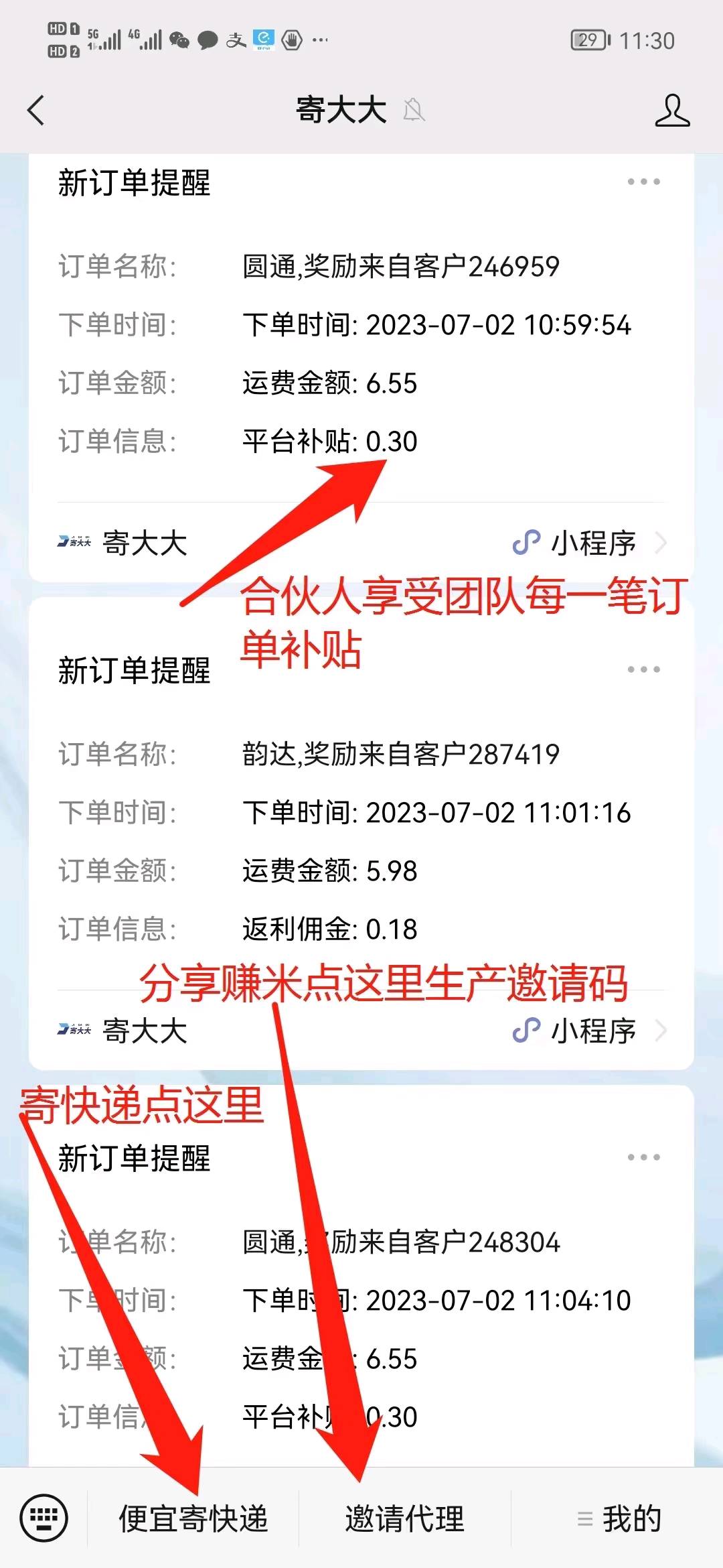 平台 享受直推合伙人团队每笔订单0.3元