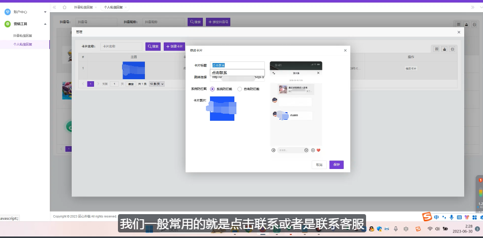我们先以进入聊天回复为例,要开启这个功能的前提是点击进入私信配置,创建你的卡片资料,我这里已经创建过了。对,就是 3 点标题链接头像,这个都是比较 DIY 的,我们一般常用的就是点击联系或者是联系客服,链接的情况下,我们一般常规就是点击卡片之后跳转到微信展示二维码,或者说是微信群,再或者是公众号二维码,再或者是 QQ 群付款链接只要是 HTTP 的都是支持的。头像我已经上传了,我这里就不再上传了。点击保存,OK,卡片的样式就已经创建完成了,我们一定要切记选,一定要把这个功能给开启,不然的话账号是不生效的。OK,这样账号就已经 OK 了。对,然后我们去看一下效果,我把投屏软件打开,忘了打开了,不好意思,稍等一下。