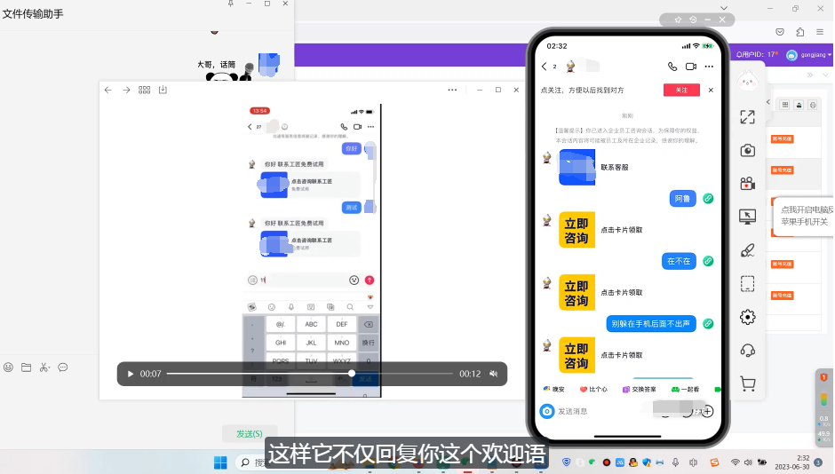 嗯,如果客户如果大家有特殊需求,比如说大家想设置一个什么场景,我给大家看一下,比如是这样的,对吧?你给他发送你好,你不想单一的回复他卡片,你还想回复他文字,然后回复他卡片,对吧?这个我们也是支持的,但是这个系统我们暂时是不支持的。对,如果有特殊需求的话可以联系我们,再或者说我们再或或者说你给它发送了关键词,它不仅它你可以设置,这样它不仅回复你这个欢迎语,看到了吗?目前场景是回复欢迎语,回复卡片,对吧?也可以说是你回复他欢迎语,回复他图片,然后再回复他卡片,也可以支持回复图片加卡片也支持,就是回复文字、回复卡片、邀请进群、回复视频、回复图片都支持,都支持,对场景支持的是很多的。然后功能二就是好多人可能需要用到群聊,就是粉丝群这一块,就是比如这个视频,对,然后大家看一下,嗯,搞错了,对,搞错了。不好意思,这不是群聊的视频,我给大家讲一下,就是这个视频,就刚才我说的,你给他发送关键词,他回复你文字回复你,图片回复你视频。