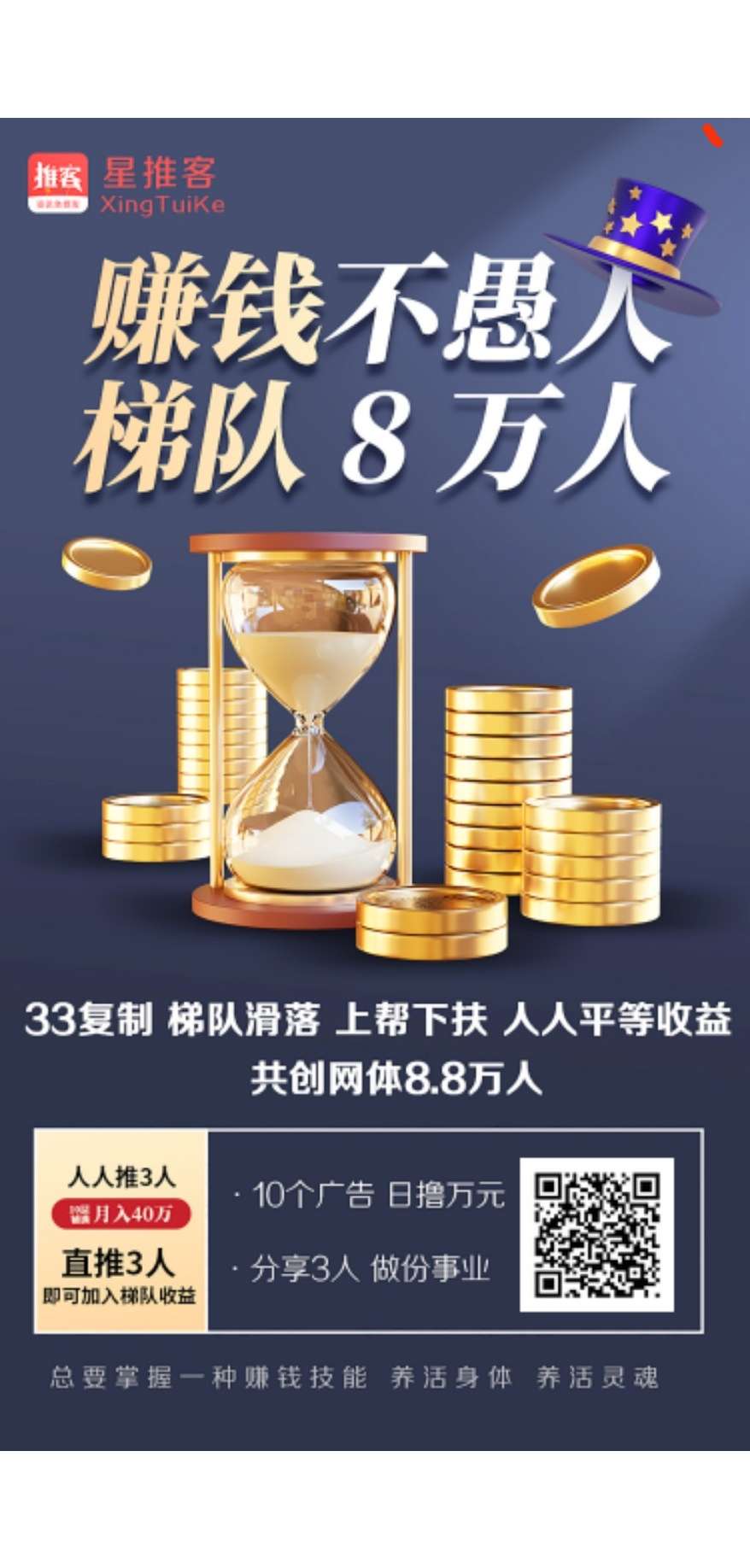 正文 星推客0投资!看广告自动滑落 网赚兼职副业 V评论者 /2023-07-11 11:39:31/2.63 K阅读/0评论 0711 星推客首码,提 1元起,自动滑落,上帮下1、收益多少:自己看10个广告任务,自己分得0.5元,10层内上级每人分0.15。自己看给别人贡献0.15,别人看广告也给你贡献0.15,如此循环,达到10层8.8万人*0.15=13200元/天2、收益条件推广3人后开始全网滑落,会员滑落到谁下面,是在谁的梯队下面,你梯队下面的任何人(10层内)看广告,你都会得到0.15的收益。0撸广告+项目发布平台+注册的越早,得到滑落的机会越大,占位抢首码,抢占市先机。三三复制全网滑落