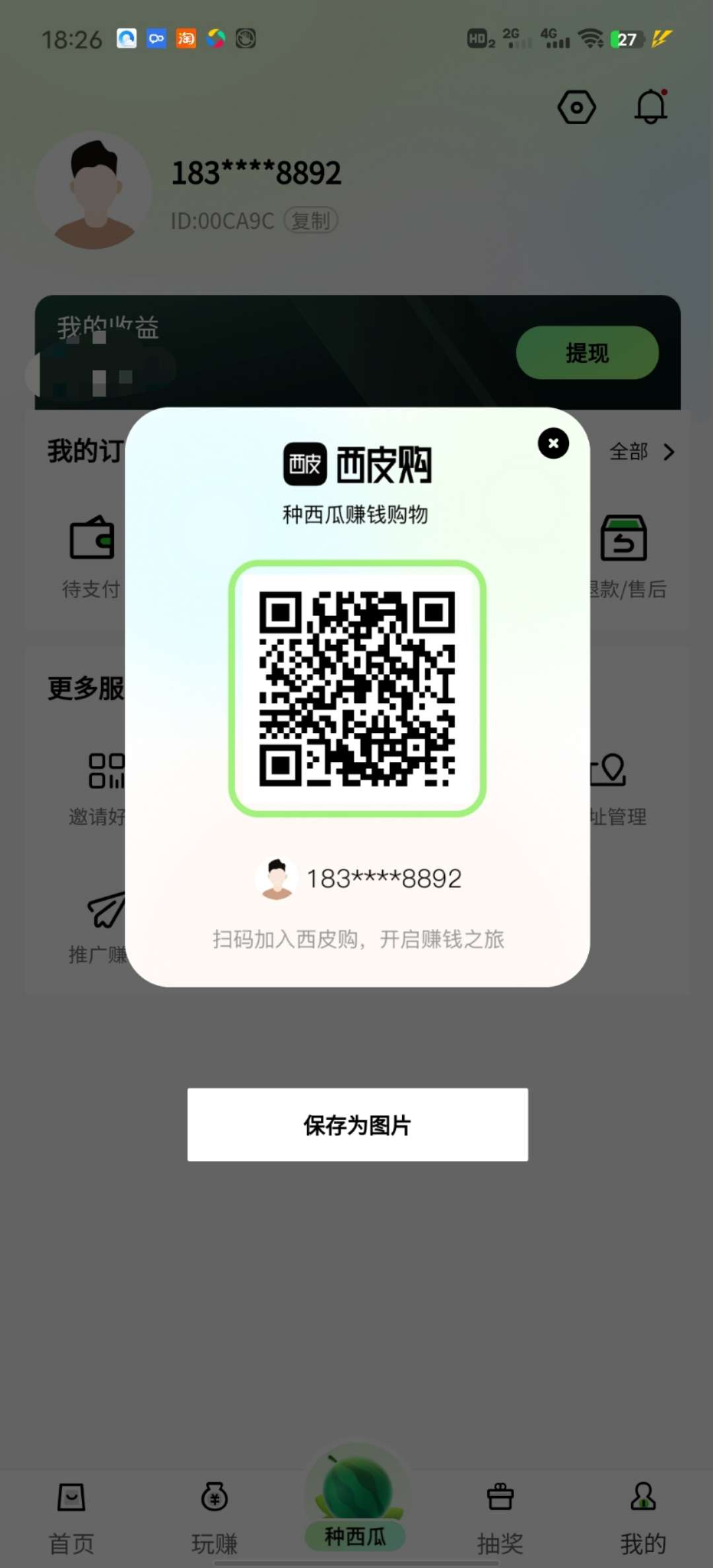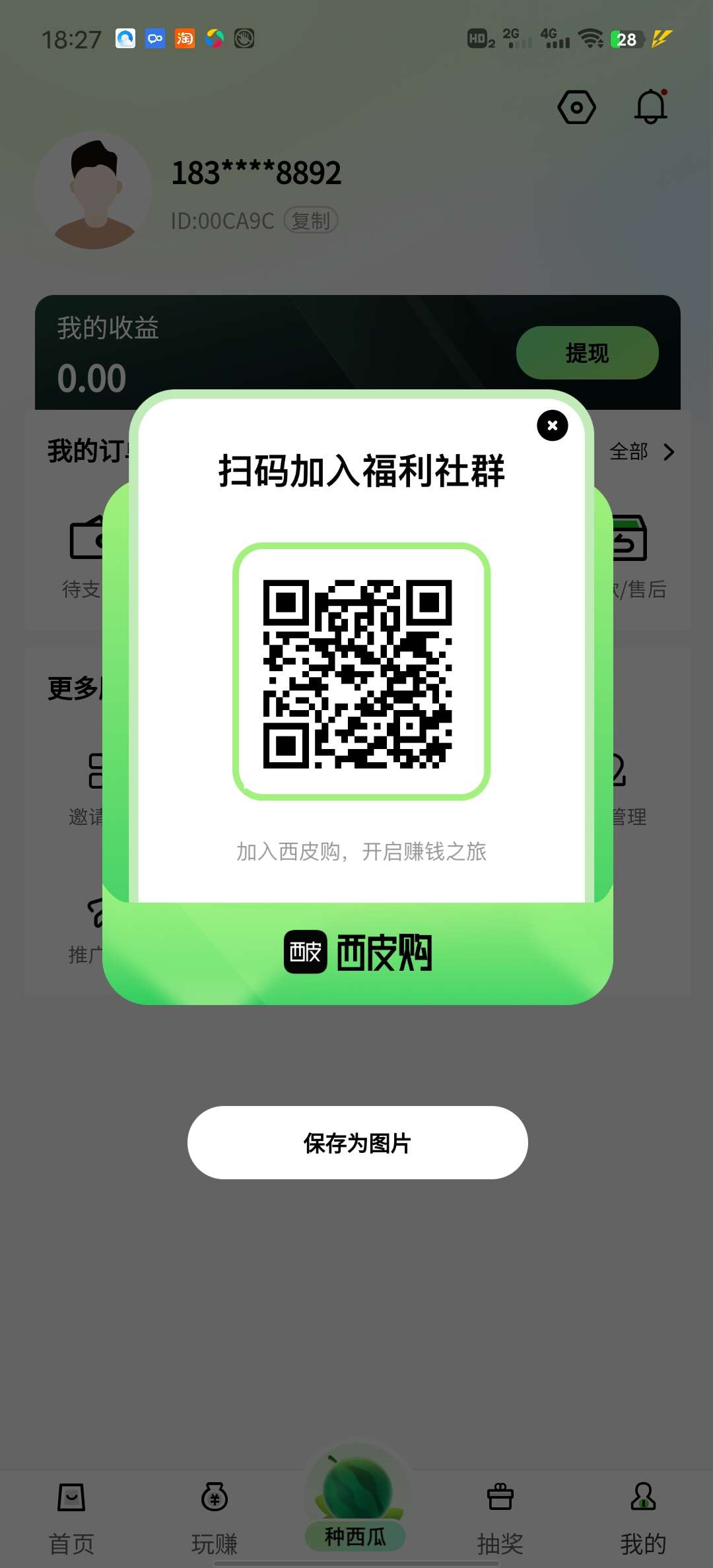 正文 西皮购每个月赚几十零花钱 荣耀执事 V评论者 /2023-07-11 18:36:15 /2606 阅读 0711 浇水,施肥。一个西瓜5毛钱。邀请越多收益越多。提现秒到账。每天记得浇水,施肥。就可以了。二代收益。还可以白嫖0撸很多商品