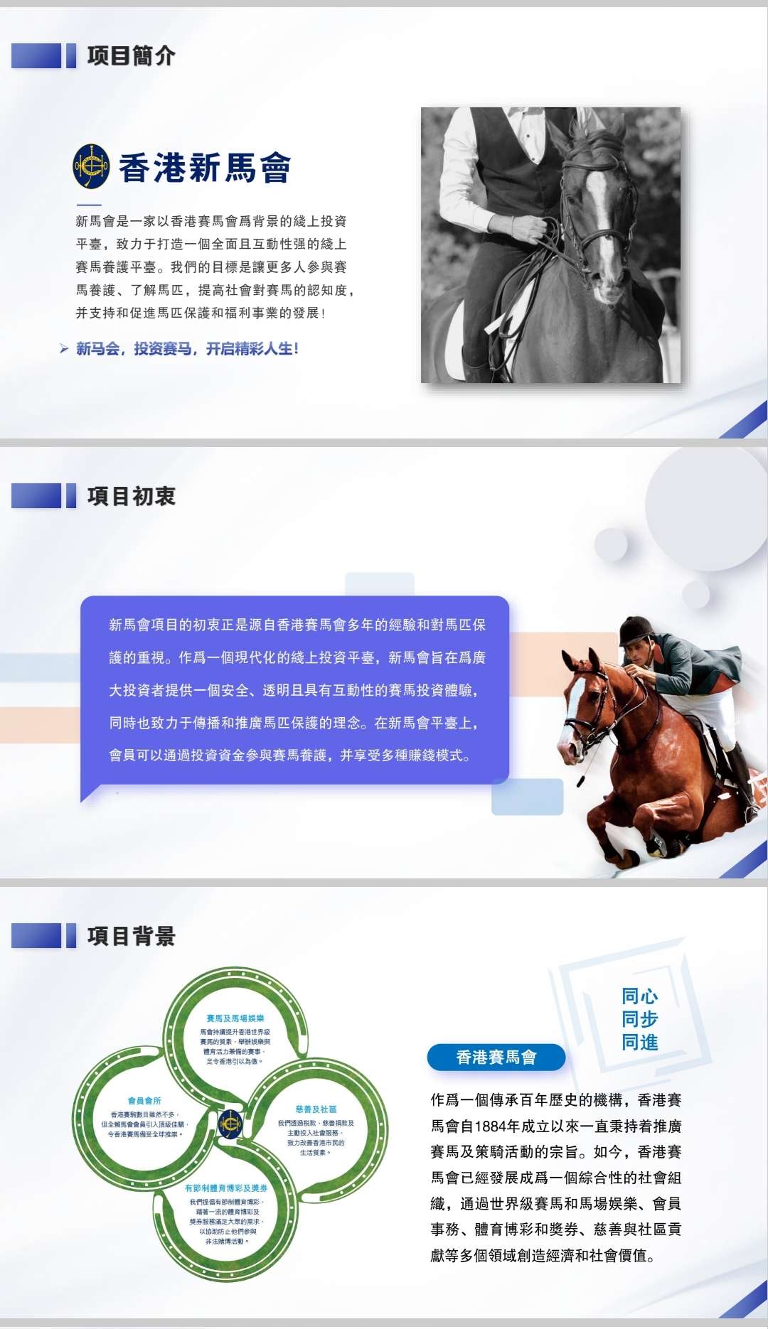 作爲一個傳承百年歴史的機構,香港賽馬會自1884年成立以來一直秉持着推廣賽馬及策騎活動的宗旨。如今,香港賽馬會已經發展成爲一個綜合性的社會組織,通過世界級賽馬和馬場娱樂、會員事務、體育博彩和獎券、慈善與社區貢獻等多個領域創造經濟和社會價值。