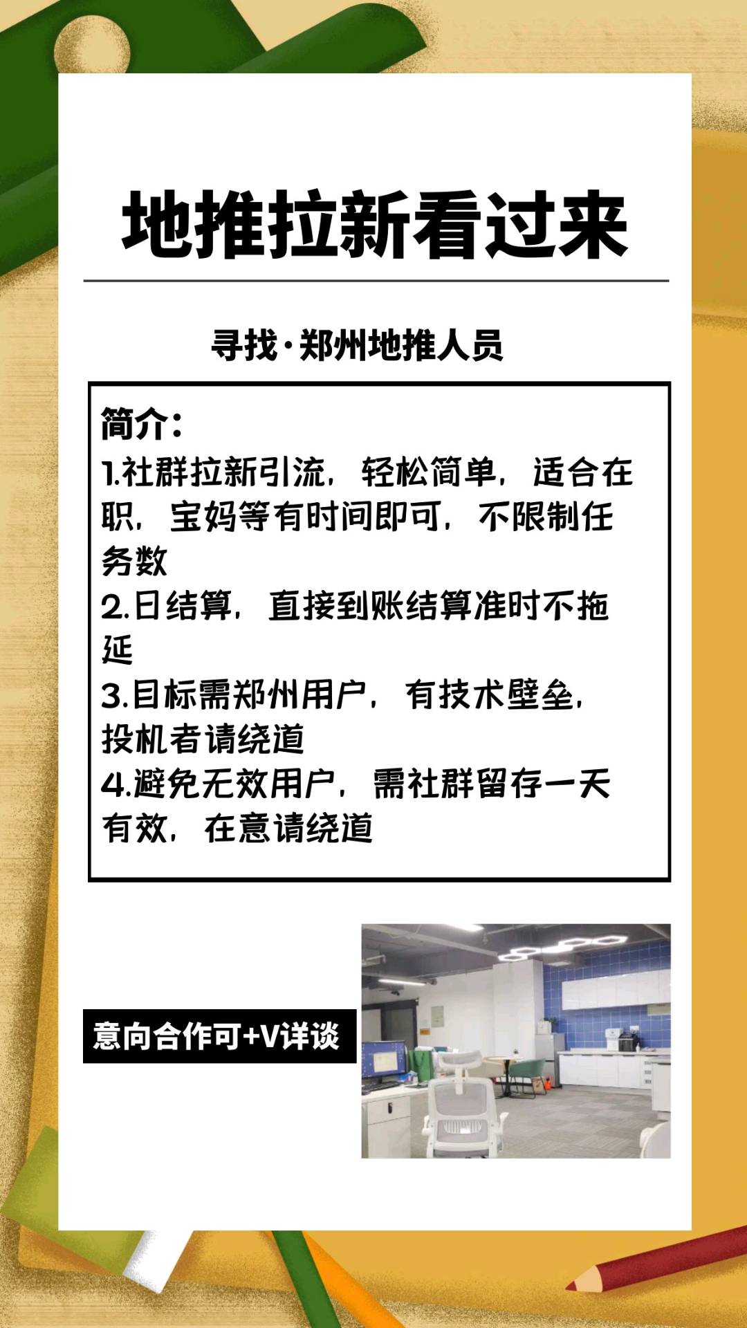 正文 邮储社群拉新项目5到6每人,日结算 网上接单平台 V评论者 /2023-07-31 14:30:46/3.43 K阅读/0评论 0731 社群拉新佣金价格5到6结算方式日结算操作流程地推拉新,轻松简单资源需求不限个人或团队,在郑州即可特别说明1.社群拉新引流,轻松简单,适合在职,宝妈等有时间即可,不限制任务数2.日结算,直接到账结算准时不拖延3.目标需郑州用户,有技术壁垒,投机者请绕道4.避免无效用户,需社群留存一天有效,在意请绕道