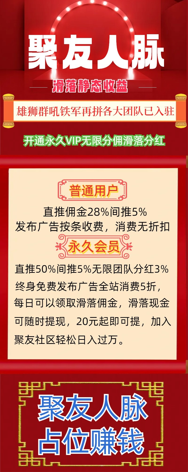 聚友人脉是一款 与 多家知名媒体达成合作的广告引流平台,找项目,发广告,加人脉,赚钱必备神器。阅读赚钱+全网公排滑落现金,您只需注册占位升级,您上级整个团队收益 和 平台90%的收入,系统每天都会自动滑落分给您,日赚200~300元。聚友人脉,是你工作以外的一份副业。