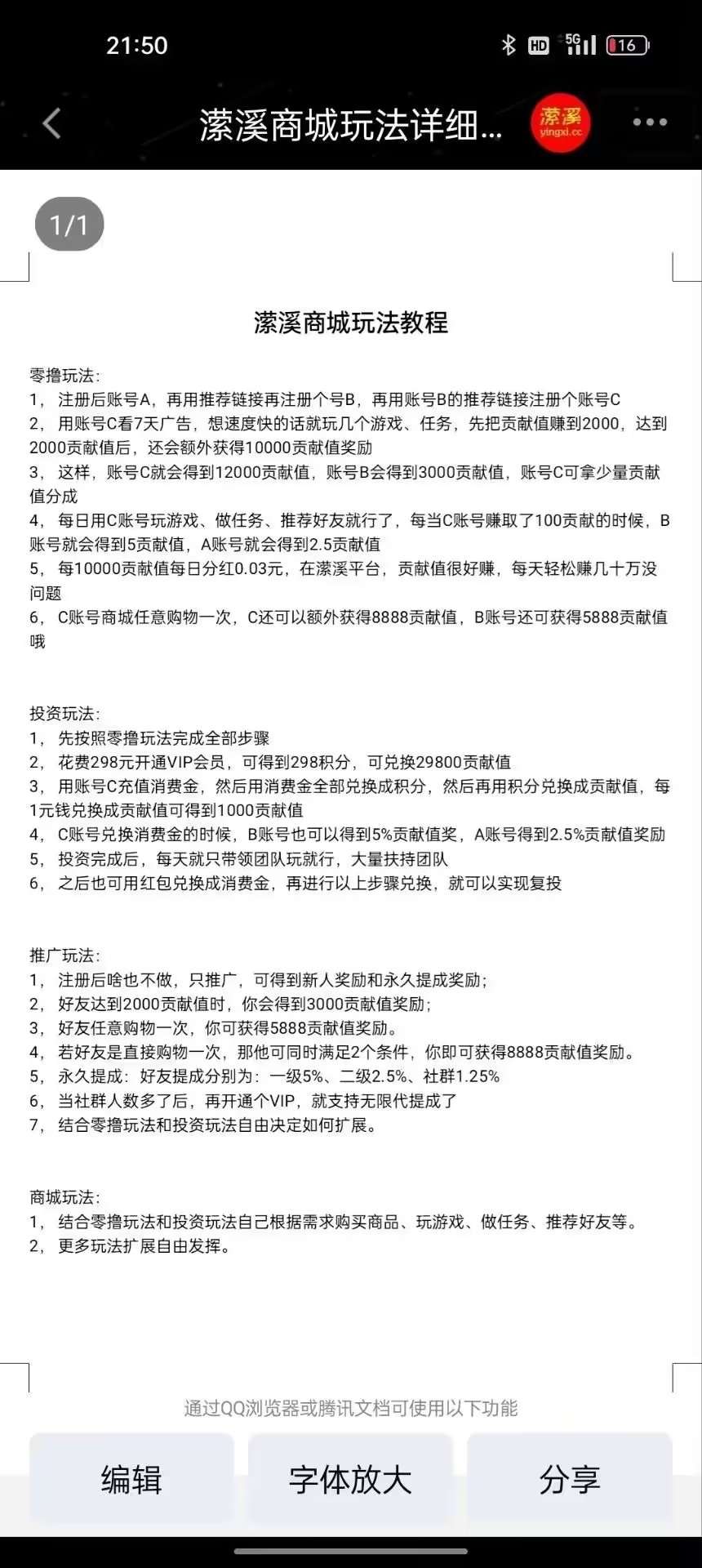 正文 潆溪商城君凤煌模式注册送18888贡献值 zhuzi123 V评论者 /2023-08-03 21:10:00/1.73 K阅读/0评论 0803 每天签到,看广告,游戏试玩,做任务,购物,邀请好友都有贡献值贡献值分红的可以复投成贡献值壮大贡献值账号也可以提现24小时到任务做活动页面注册实名以后在首页下一个2.58的用户手册即可获得18888贡献值
