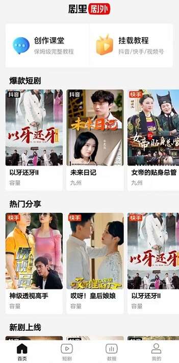 剧里剧外CPS推广,好省原班团队开发运营,大公司旗下稳定长久,形式和小说推广差不多,前面几集免费观看,想看后面剧情就要开会员或者看广告,短剧都是网络小电影,这种网剧剧情一般比较紧凑,爆点较多,精准抓住了用户们的注意力,拥有天然的流量优势,0粉丝就能做,最高70%分成。