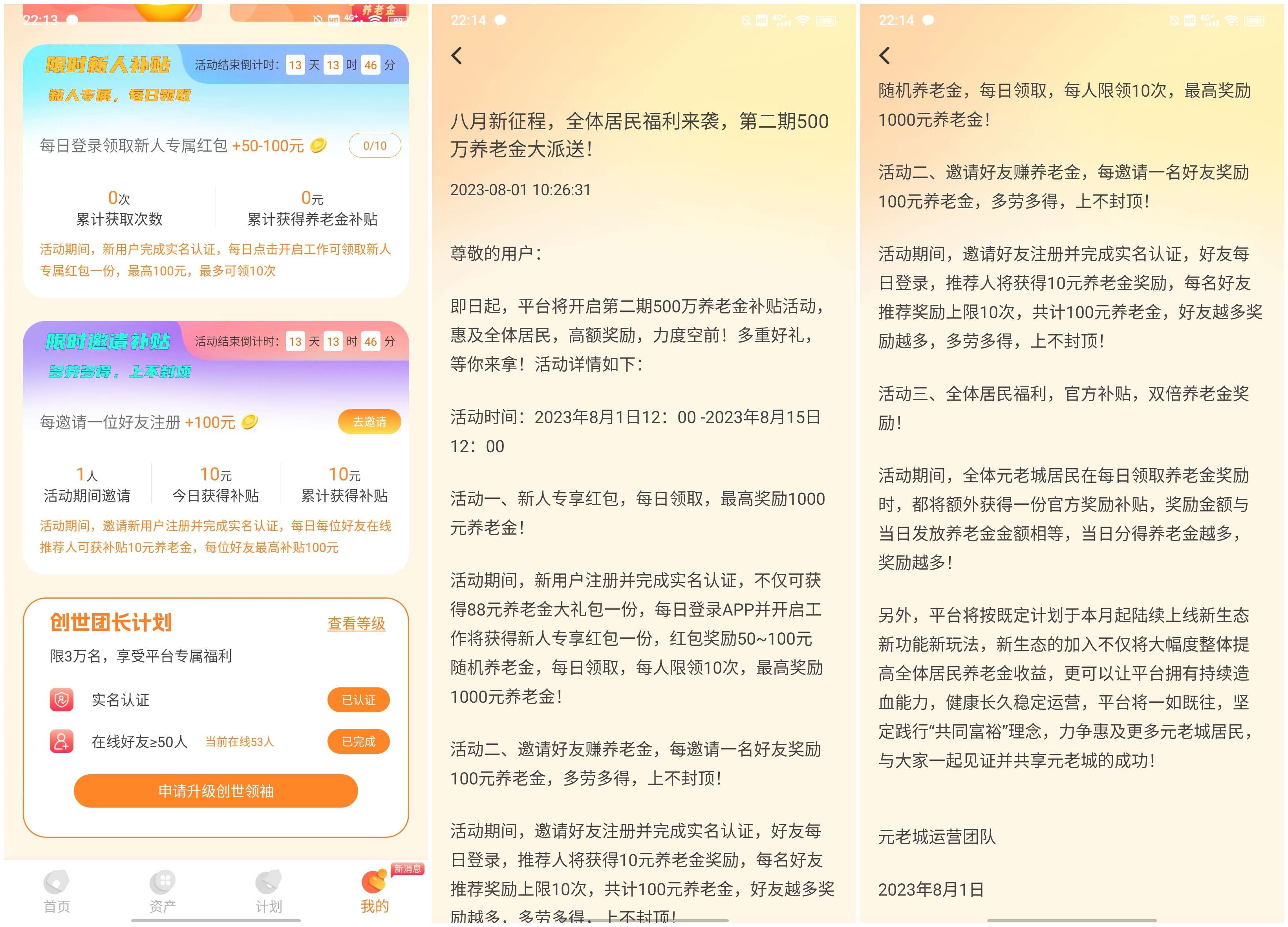 每邀请一位好友注册完成实名认证,每日每位好友在线最高补贴10元养老金,每一位好友最高可获得100元。