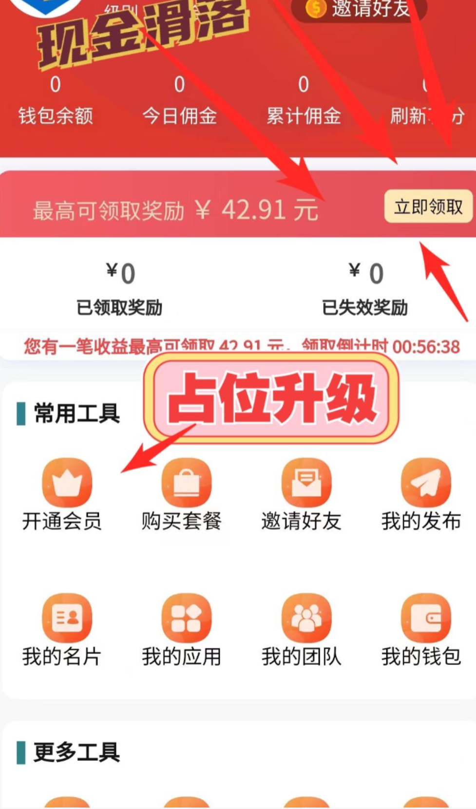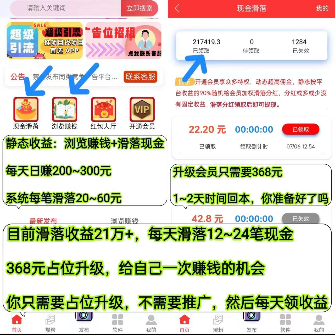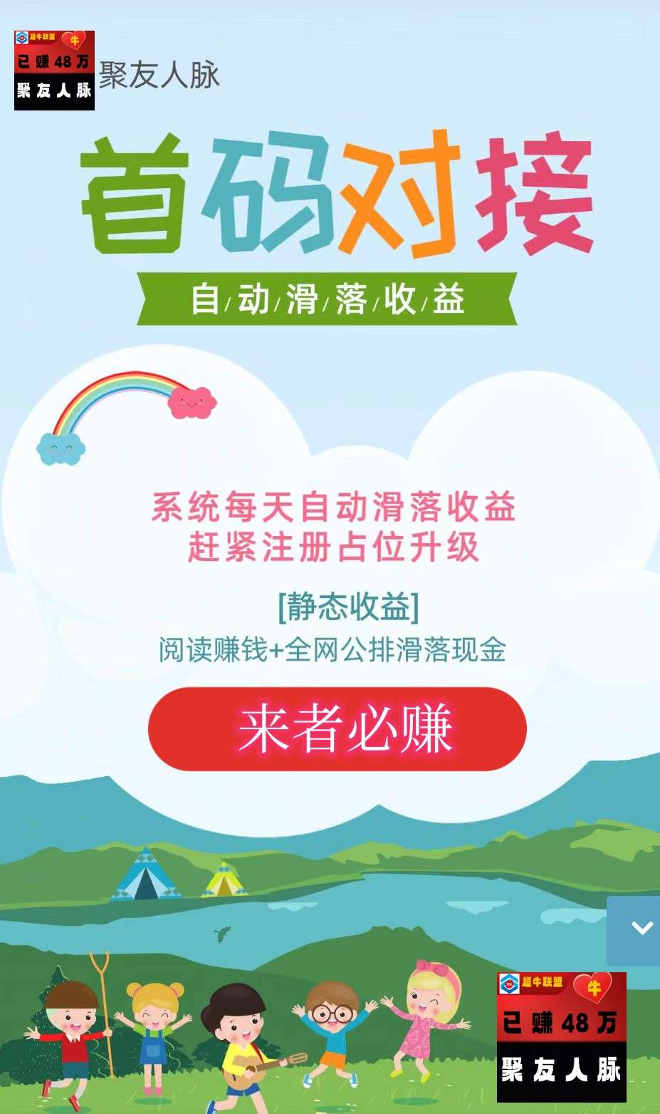 2、静态收益:阅读赚钱+全网公排滑落现金,您只需注册占位升级,您上级团队收益,系统每天自动滑落分给您,日赚200~300元。