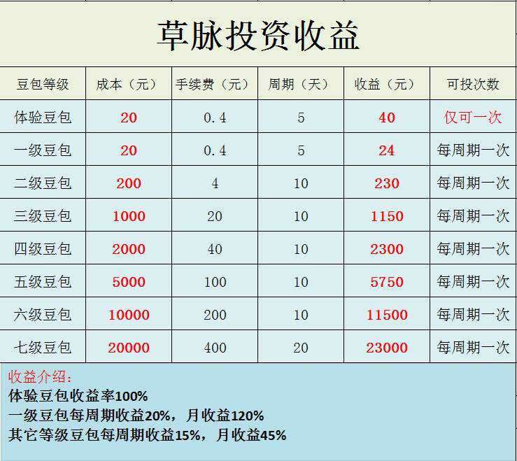 正文 草脉首码,注册送20豆,每天领取分h 白小纯 V评论者 /2023-08-11 17:10:38/1.93 K阅读/0评论 0811 草脉,注册送20豆:每天分红人人可以用20豆兑换一次体验豆包,5天产出40豆!花20元买码,5天就可以先回本20元,以后每个月都可赚27元推一个人共得8元1、他注册实名后,你先得2元2、他第一次用注册送的20豆复投,你马上又得5+1元,总6元以后他每次复投你得5%,比方他用100元买豆复投,你就是得5元一次,一个月得6次就是30元。