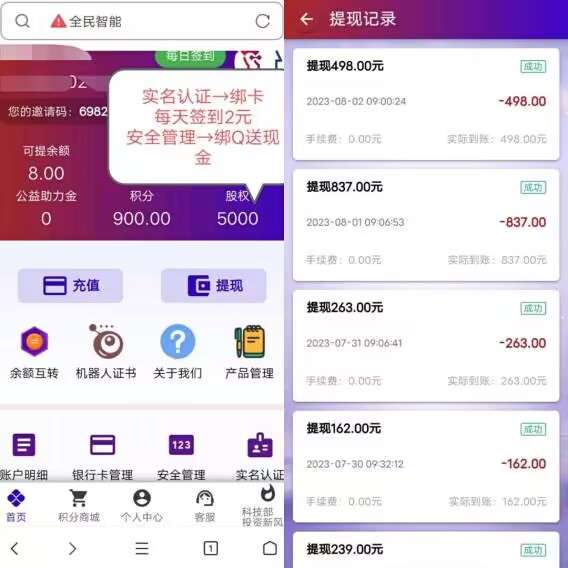 正文 全民智能,引领人工智能时代的到来,红利不断需紧紧抓住 wjgh1326896 V评论者 /2023-08-16 16:07:55/1.77 K阅读/0评论 0816 每天零撸2元,余额满50元,零撸也可以堤现到帐。 1、实铭绑卡,激活机器人(可留作自用、可回收变现、可出租赚租金)。 2.注册赠送100积分(可兑换现金、可积分抽奖)。 3.注册赠送5千股权(原始股权可变现30000元)。 4.注册赠送60元(可转换认购项目使用)。 5.绑定QQ送现金(自动赠送到可提余额)。 6.激活就送价值168元大豆被子一床。 ☞☞推广福利 : ①、认购返利 : 一级20%,二级4%,三级2%, ②、团队福利→三重福利可以叠加享受,互不冲突。