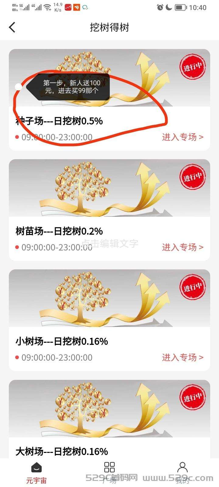 1.每天早上9:00在软件元宇宙界面参与交易。比如新人可以在第一栏种子场进入,买入竞拍99颗树苗,然后平台自动卖出,收益自动到账到我的摇钱树余额里。