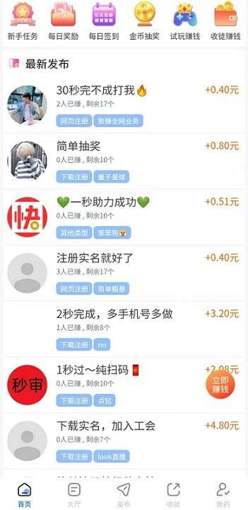 闪赚是新出的任务悬赏平台,很多流程简单的注册、助力任务,任务、提现、试玩二级分成,直推完成首单奖5元,直推首次提现奖2元,2元起提秒到。