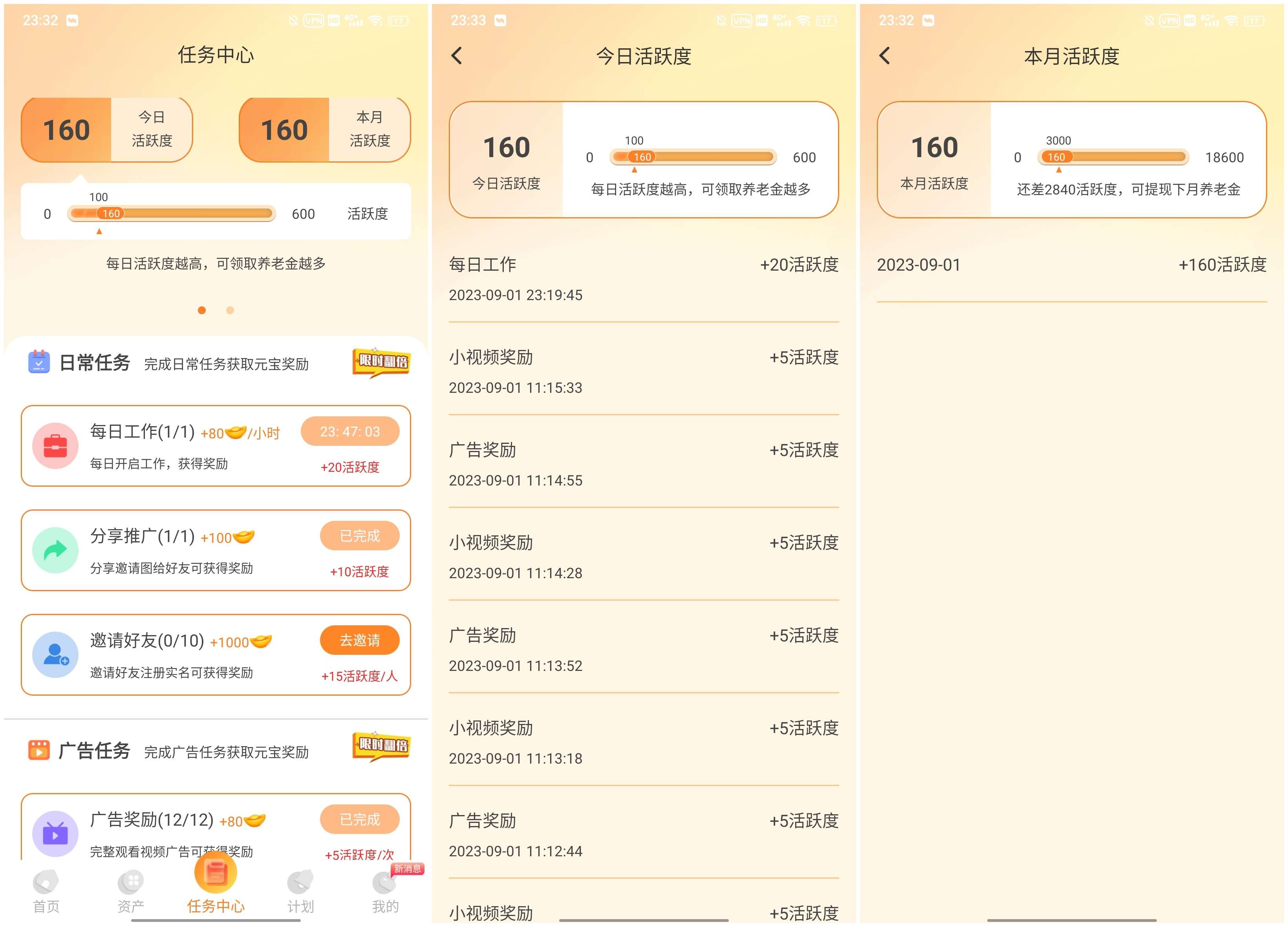3. 完成每日任务可以获得元宝和活跃值。活跃值越高,第二天领取的养老金加成越多