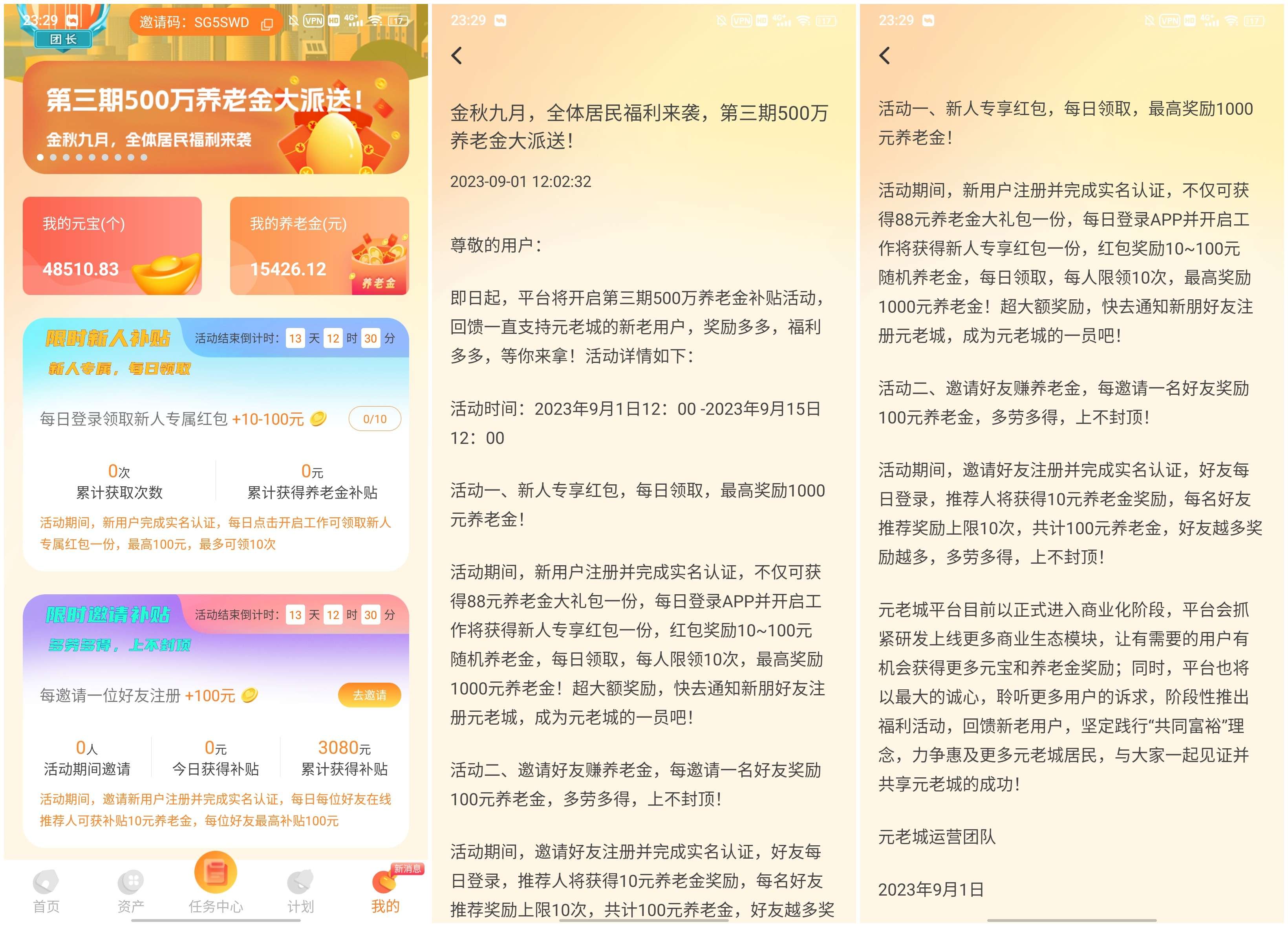 二:9月1日-9月15日,每邀请一个好友实名完成获得100养老金,无上限,好有每天上线点击工作获得10元养老金,每位好友可以获得10次共计100养老金。