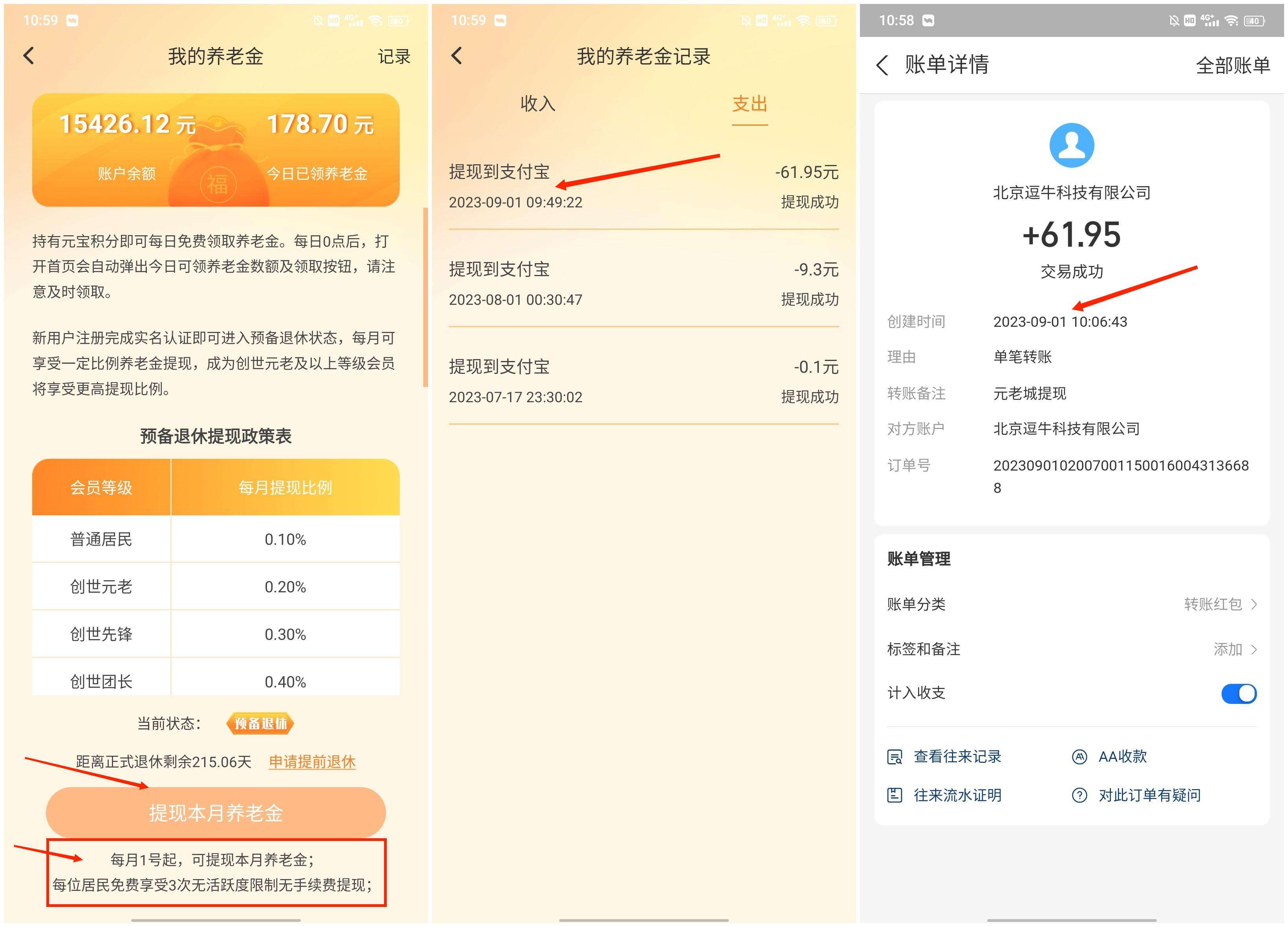 根据推广好友数量(实名完成+开启工作)可使用元宝提升自己的会员等级,提高退休前养老金提取比例(重点),最高提升至0.7%。