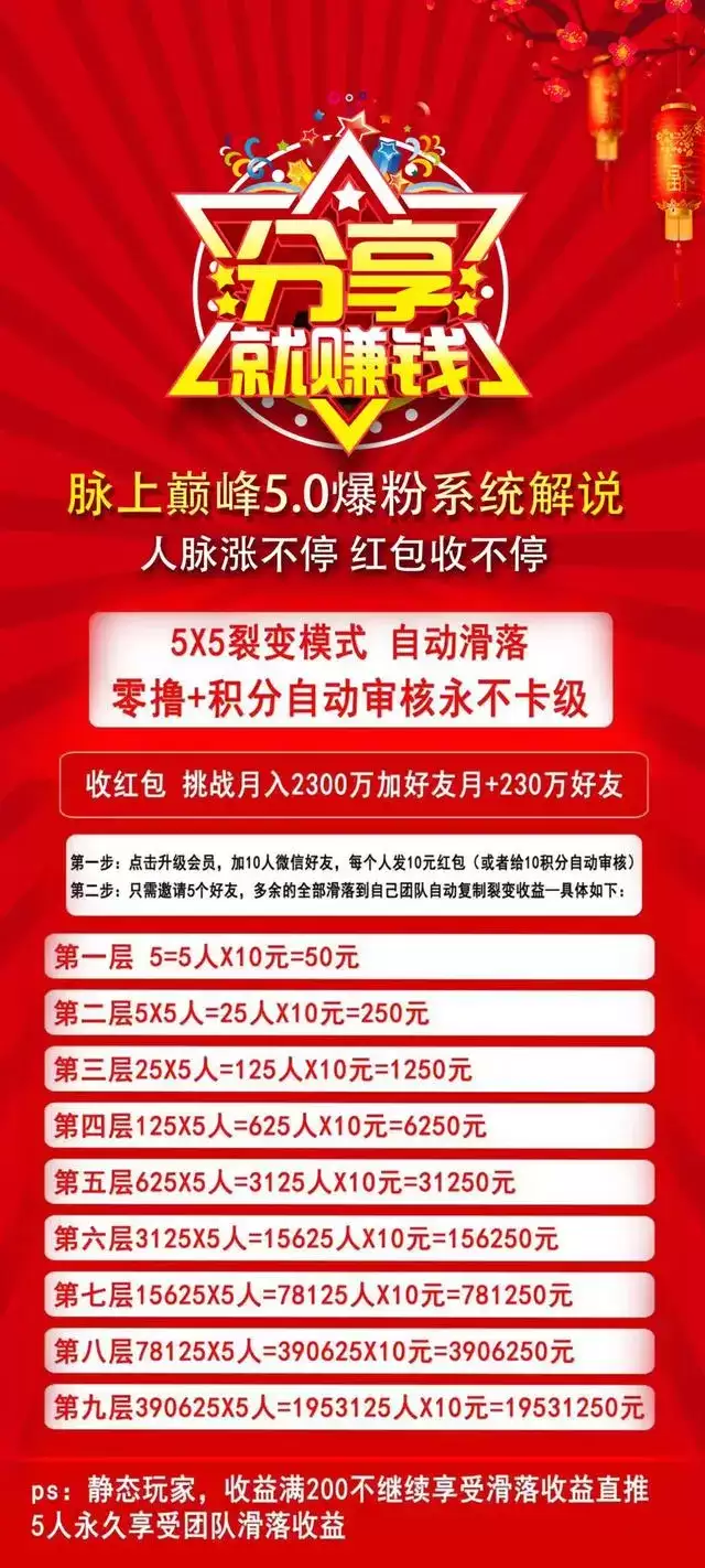 这个流量为王的时代,不管你做什么行业都需要强大的流量。脉上巅峰全新5.0爆粉系统?5X5复制公排裂变滑落模式,视频广告收益,人脉红包,群二维码发布,积分商城,后续会上任务共享。全程可0撸,打造真正的人脉共享,红包不停,看广告收益不停,推广好友加不停。