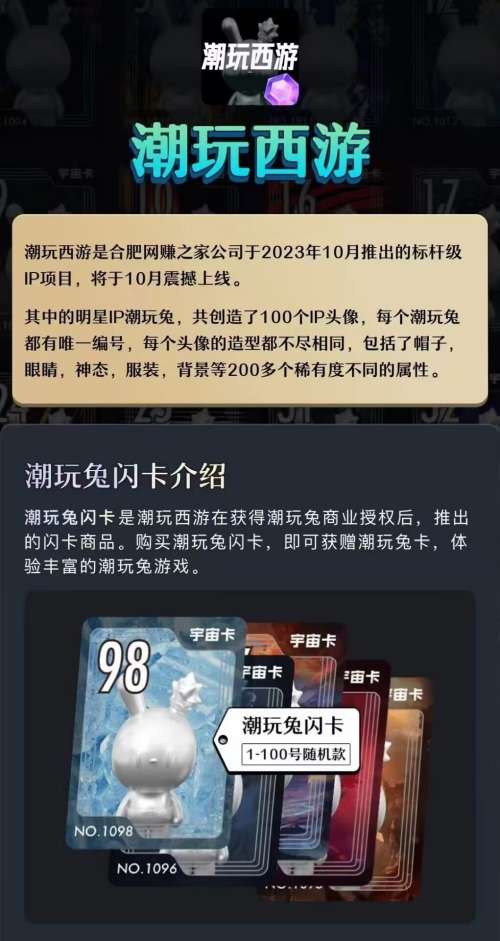 正文 潮玩西游,即将上线,跨年大项目,实力公司,政策拉满 yiqifa88 V评论者 /2023-10-17 21:44:46/1.72 K阅读/0评论 1017 潮玩西游可零撸可投资,上线所有应用商店,无泡沫上线,吊打潮玩宇宙,新机遇新神盘,中国最牛逼的模式是什么是复制!错过潮玩,不要错过潮玩西游!潮玩西游是合肥网赚之家公司于2023年10月推出的标杆级 IP项目,将于10月震撼上线。其中的明星IP潮玩兔,共创造了100个IP头像,每个潮玩兔 都有唯一编号,每个头像的造型都不尽相同,包括了帽子, 眼睛,神态,服装,背景等200多个稀有度不同的属性。潮玩西游首码群:319522756