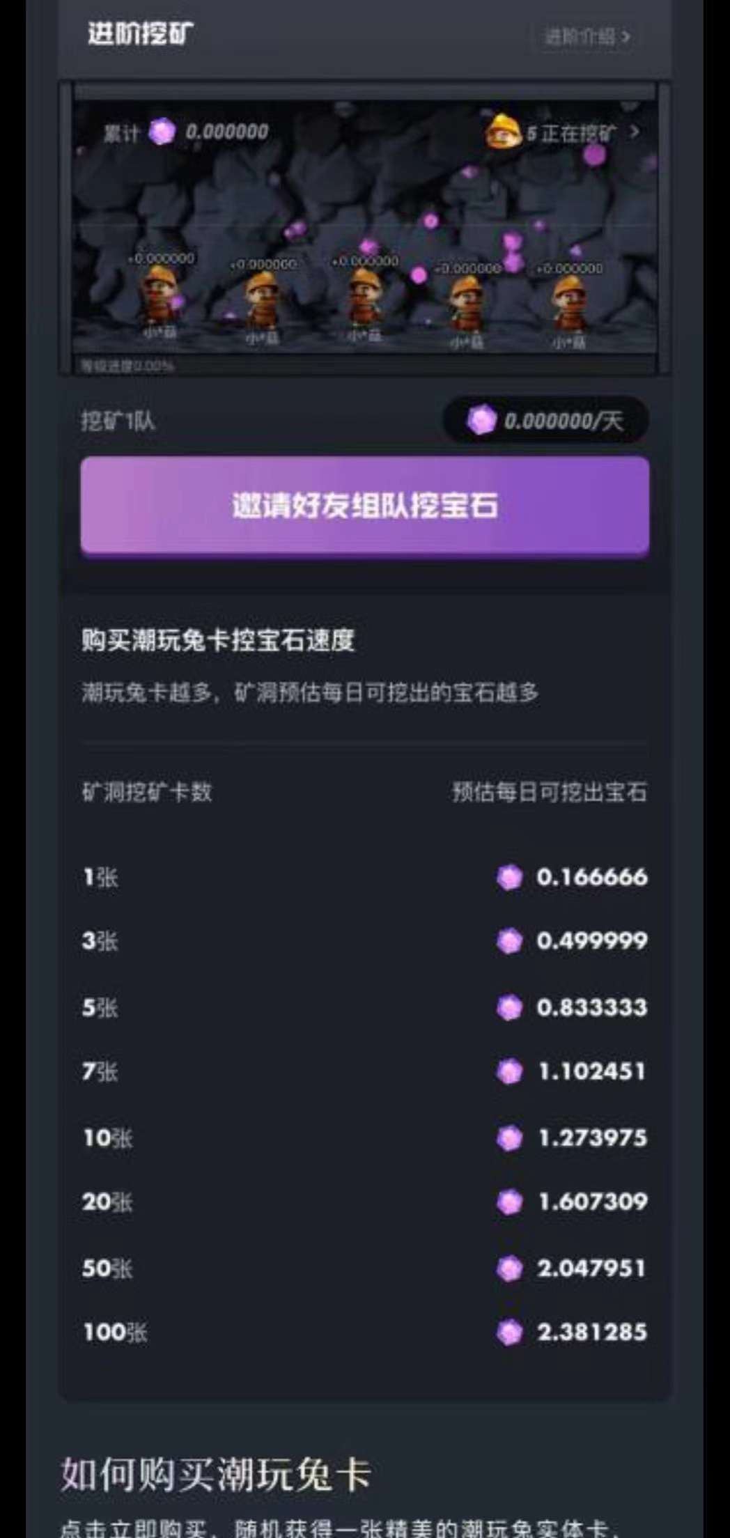 玩法介绍:一人一号,永久挖,147等于7只兔子,每天自动挖1.1宝石。官方兜底5元,不到一个月回本,进群了解