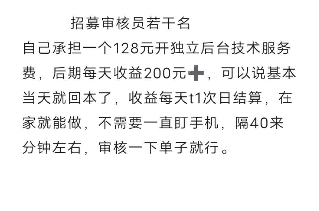 每单大概有2块钱以上利润,一天审核100单,就是200元,一天审核1000单,就是2000元,没有夸大,我下边干的好的,他们偶尔一天审核1300的单子,就是2600块钱收益。反正多劳多得。