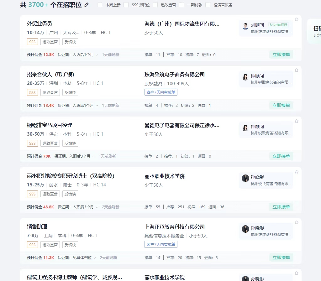企业审核简历通过后,邀约面试即可获得几千元佣金。入职成功一个人才,我们将再次获得1-3W的佣金。