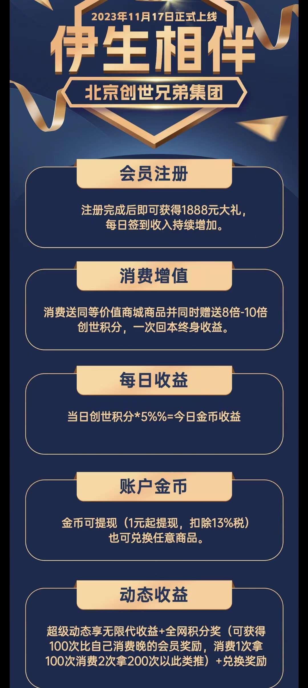 正文 伊生相伴首码,君凤煌模式,注册送奖励,每天释放 白小纯 V评论者 /2023-11-22 09:54:08/1.62 K阅读/0评论 1122 伊生相伴注册即送1888积分当日收益百分之5消费增值 每天积分释放成金币金币可提,一元起提。随便购买一单十几块钱的,就可以享受全网滑落,占位越
