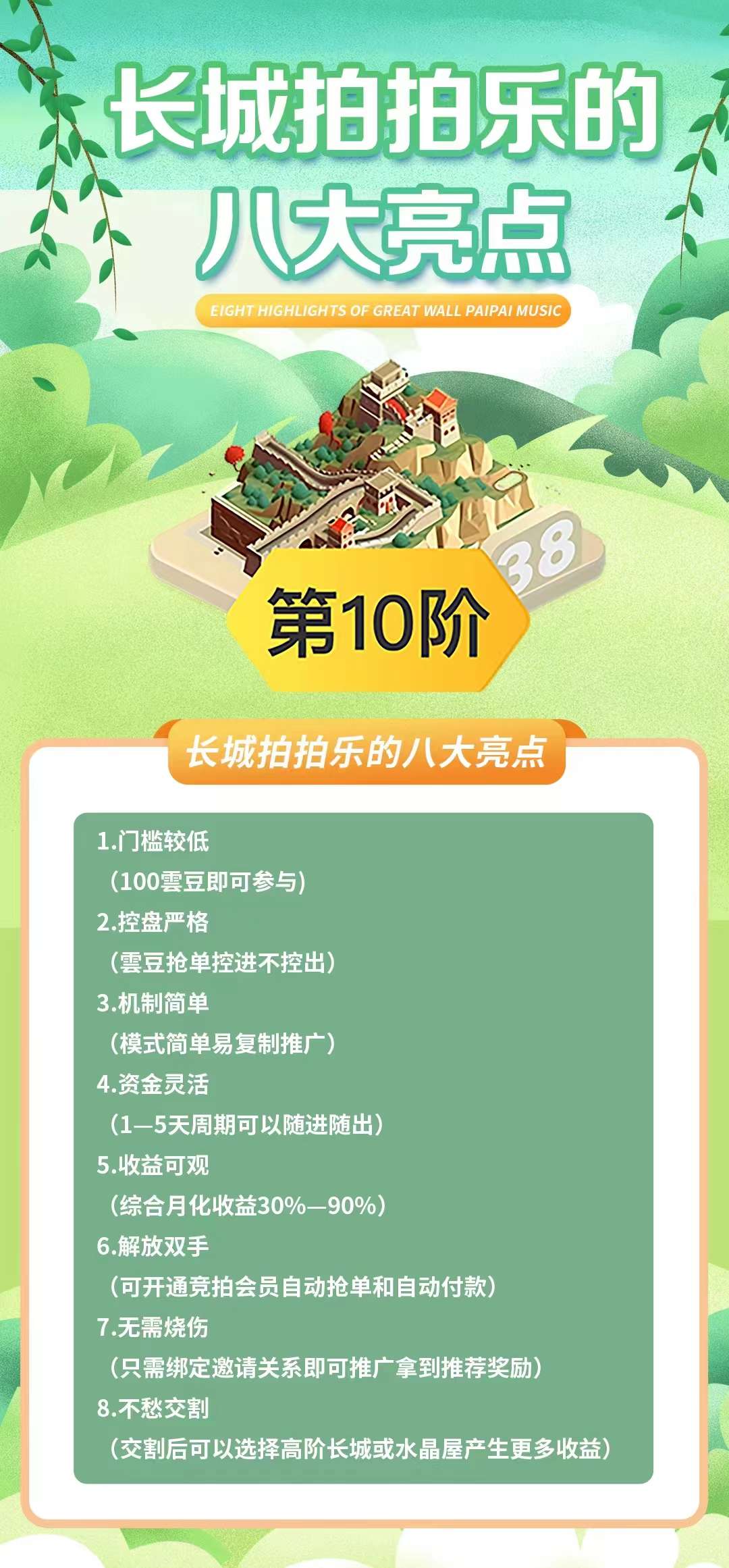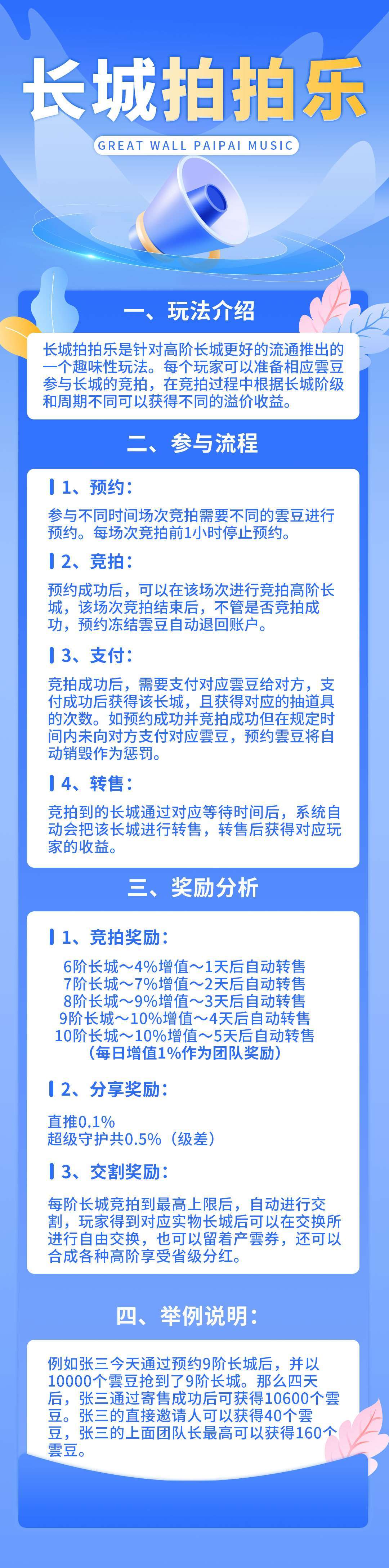 长城拍拍乐是针对高阶长城更好的流通推出的一个趣味性玩法。每个玩家可以准备相应雲豆参与长城的竞拍,在竞拍过程中根据长城阶级和周期不同可以获得不同的溢价收益。