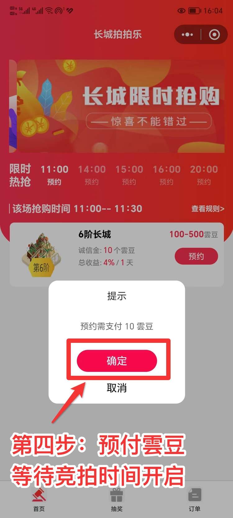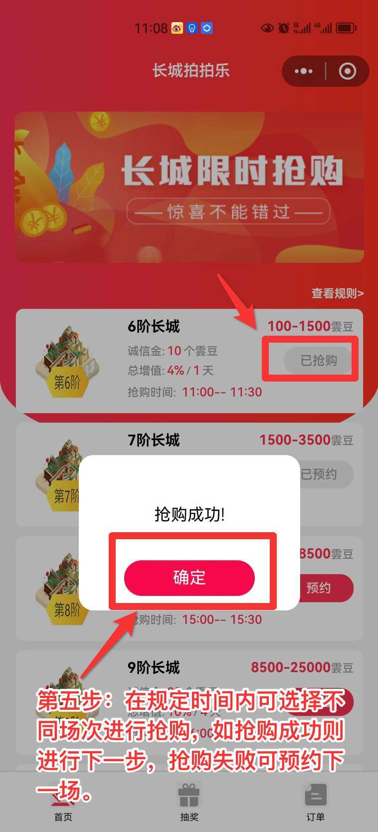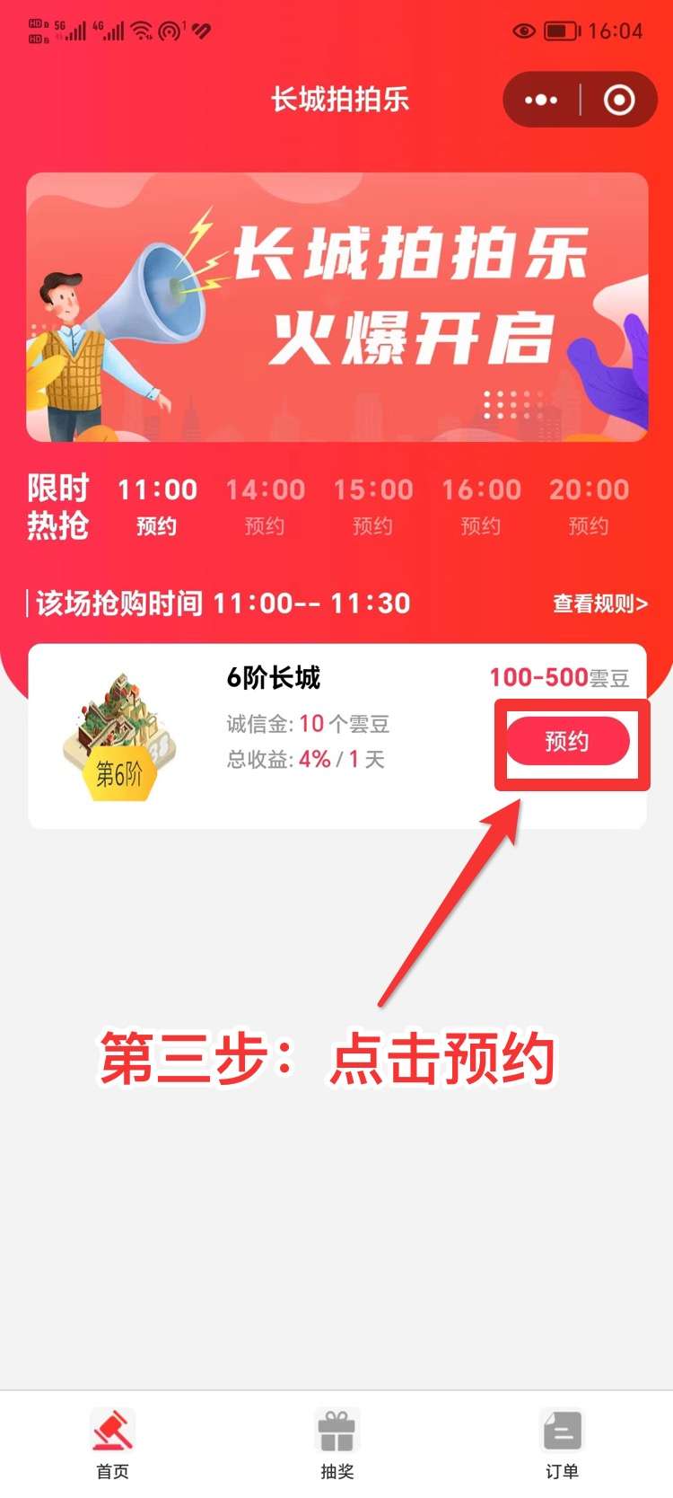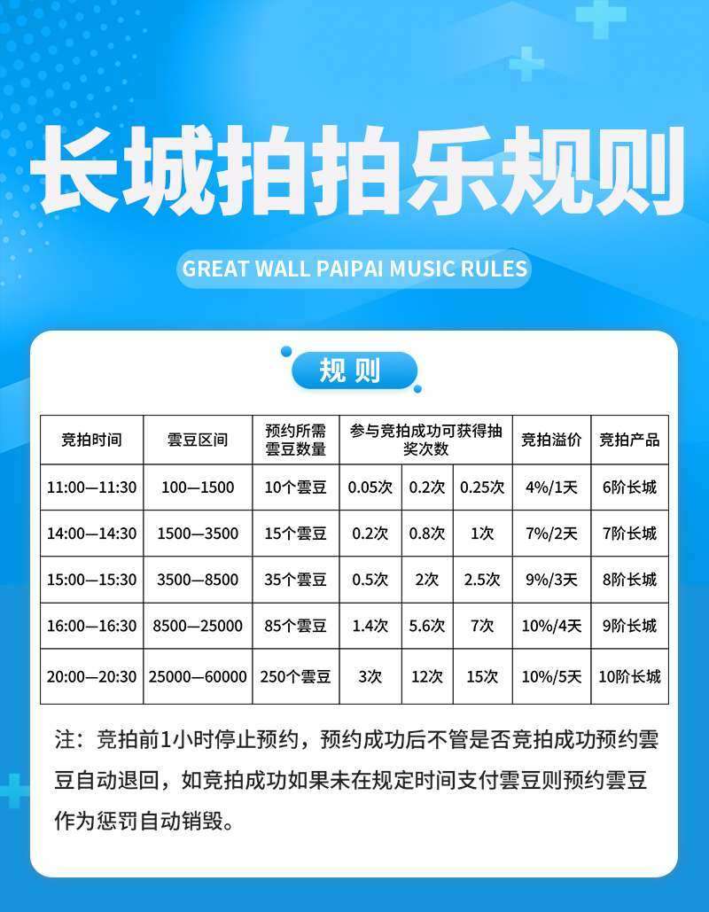 2.竞拍:预约成功后,可以在该场次进行竞拍高阶长城,该场次竞拍结束后,不管是否竞拍成功,预约冻结雲豆自动退回账户。