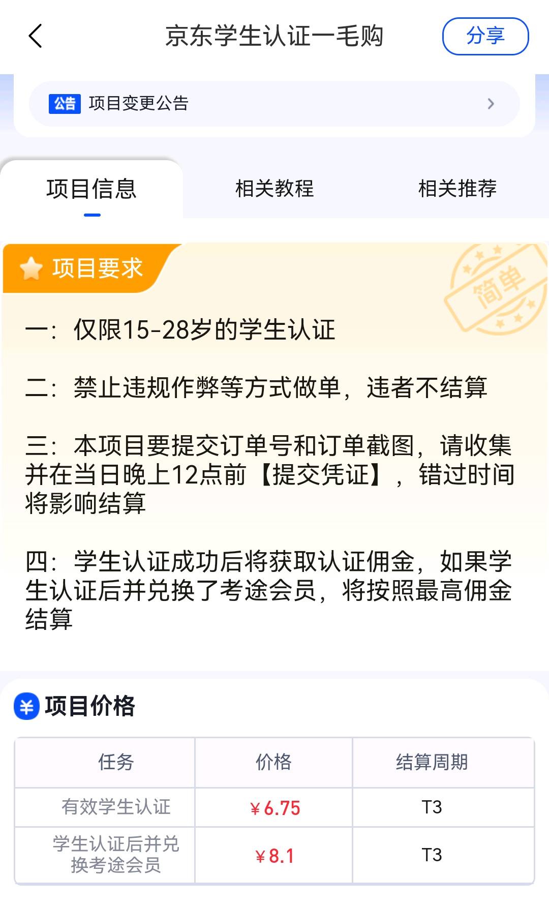 正文 京东学生认证一毛购,有学生资源的来合作 地推app接任务平台 V评论者 /2023-12-06 09:33:55 /2009 阅读 1206 京东学生认证一毛购,最高8块多一单佣金价格8元+/一单结算方式T3,独立后台操作流程一:仅限15-28岁的学生认证二:禁止违规作弊等方式做单,违者不结算三:本项目要提交订单号和订单截图,请收集并在当日晚上12点前【提交凭证】,错过时间将影响结算四:学生认证成功后将获取认证佣金,如果学生认证后并兑换了考途会员,将按照最高佣金结算资源需求有经验的地推团队、工作室、大学生,或者有学生资源的