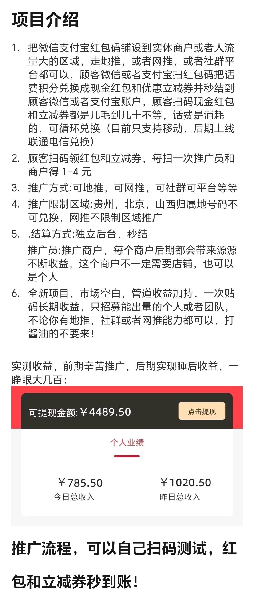 1. 把微信支付宝红包码铺设到实体商户或者人流量大的区域,走地推,或者网推,或者社群平台都可以,顾客微信或者支付宝扫红包码把话费积分兑换成现金红包和优惠立减券并秒结到顾客微信或者支付宝账户,顾客扫码现金红包和立减券都是几毛到几十不等,话费是消耗的,可循环兑换(目前只支持移动,后期上线联通电信兑换)2. 顾客扫码领红包和立减券,每扫一次推广员和商户得1-4元3. 推广方式:可地推,可网推,可社群可平台等等4. 推广限制区域:贵州,北京,山西归属地号码不可兑换,网推不限制区域推广5. .结算方式:独立后台,秒结推广员:推广商户,每个商户后期都会带来源源不断收益,这个商户不一定需要店铺,也可以是个人6. 全新项目,市场空白,管道收益加持,一次贴码长期收益,只招募能出量的个人或者团队,不论你有地推,社群或者网推能力都可以,打酱油的不要来!实测收益,前期辛苦推广,后期实现睡后收益,一睁眼大几百: