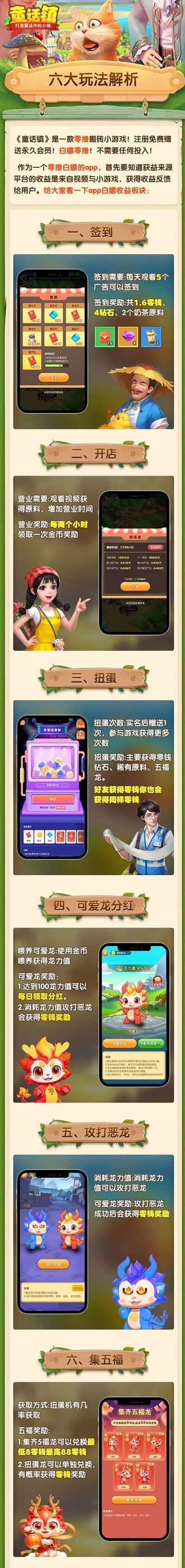 正文 童话镇:注册送VIP,0投资多种收益模式,邀请团队收益 xd3042 V评论者 /2024-01-11 11:26:09/1.56 K阅读/0评论 0111 童话镇是一款广告与小游戏赚钱的APP,全程0投资,每天签到、看视频、玩游戏都可以获得钻石与金币,官方兜底变现,邀请团队收益。VX扫码注册,官方群:455425169邀请奖励很高,而且是无限代团队收益,另外下级扭蛋或者开通会员也都有分成。玩法很简单:1、每天5个广告签到获得奖励;2、开店营业每两小时获得金币;3、参与游戏可获得扭蛋抽奖;4、金币喂养可爱龙获得奖励;5、攻打恶龙获得奖励;6、集五福获得奖励。